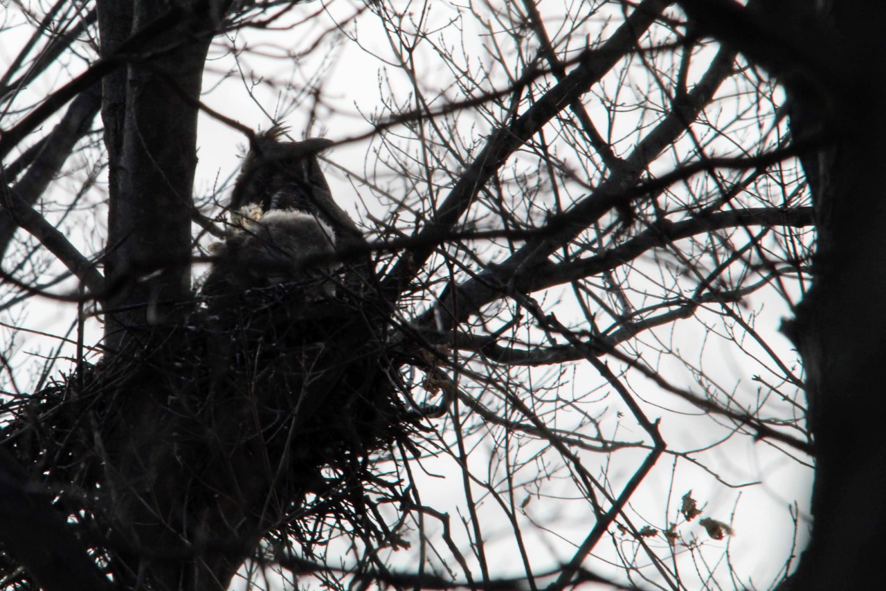 So far the box hasn’t had much attention given to it but I’m keeping my fingers crossed. I did however find a pair of Great Horned Owls nesting back there for the 4th year now. They have moved 3 times though because of clearing the ash trees back there and then last year’s nest was not the best spot; this year is a very good spot and they have a single fledgling now. Not too good of a picture but I try to keep my distance [As all photographers should!]