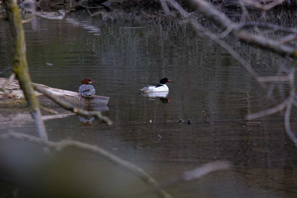 Although I love getting to know the regulars, it’s exciting when every now and then some notable birds show up! Aliya went birding at my local park a while ago, and saw the first MYWAs there…and I found them a few days later (April 14). The result: happy Eila, not-so-happy neck :). Flocks of TRES have returned and are busy cleaning up the gnats that are overwhelming the lakefront. I saw my first RCKI on April 13th, and then saw another two days ago…it was a beautiful male puffing up its crown and belting out a song for 5 minutes from in the bushes, while I stood 1.5 metres away! I also watched a HERG [Herring Gull] chase a pair of RBME [Red-breasted Mergansers], trying to land on them only to find the merganser dove down and popped up a few meters away. They went on like that for a good 10 minutes…maybe the HERG was mad at the mergansers for stealing a fish or something? It was pretty entertainting though!