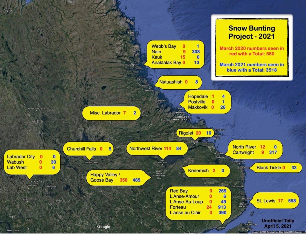 The Labrador Snow Bunting Project (on Facebook), created by Cheryl Davis and Vernon Buckle, has been very interesting to follow. The idea for it grew out of the tedium of COVID-19 stay at home demands which left people without much to do. So….why not look for and report on the arrival of Snow Buntings on their return migration to the Arctic!? (I almost wrote Canadian Arctic but it has become clear that a good number of the birds migrating through Labrador are on their way to western Greenland.)