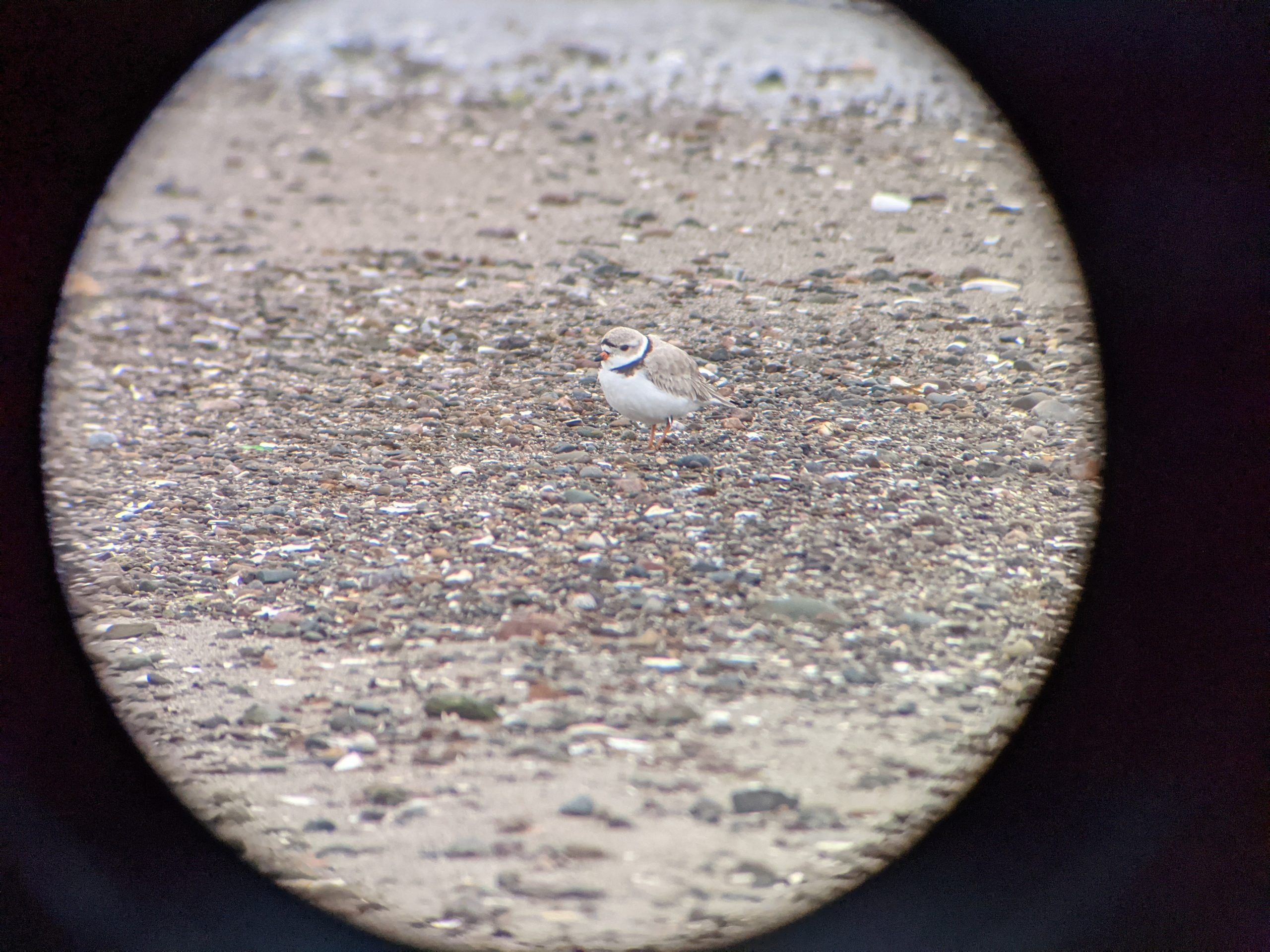 [Many of you, who have been associated with HBO for some time, will remember Jeff MacLeod from his days of working on a Master’s at McMaster (and a banding subpermit at HBO). He went on to earn his PhD in clinical psychology from Dalhousie and now practices on Cape Breton Island. But that just pays the bills. His real passion (next to his family) is studying birds. Jeff is the guy that founded this blog and continues to support me in carrying it on by solving every and all technological questions. Below is a description of a sighting that he made of a Piping Plover, taking a picture with his scope and camera that was good enough to read the bird’s band. This lead to an intriguing story about this bird’s travels:]