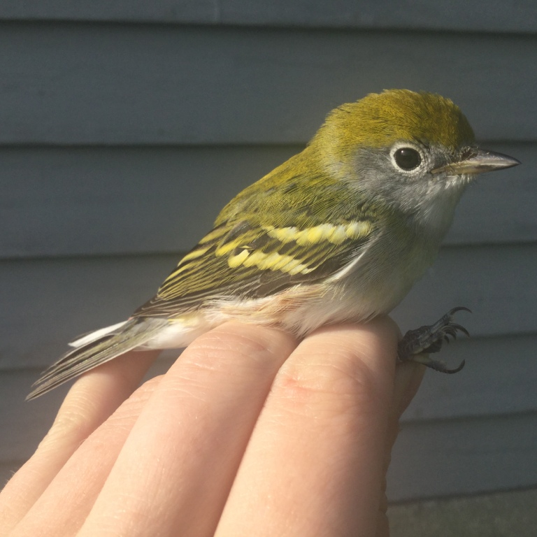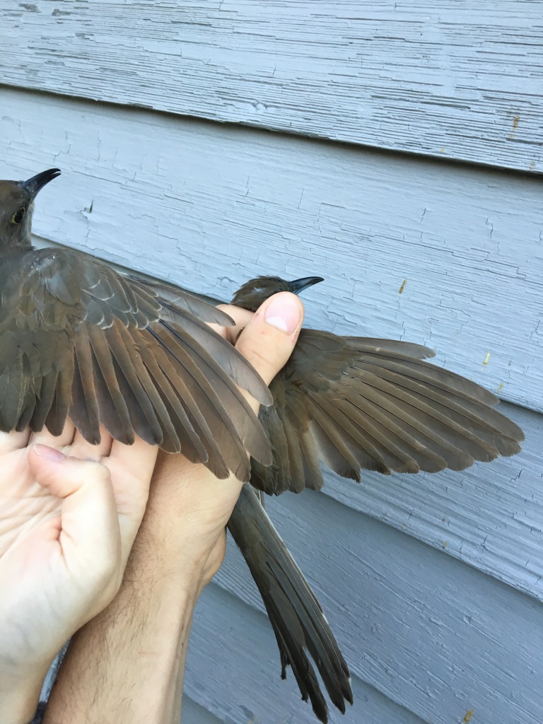 While the folks on the Texas coast are battening down the hatches in anticipation of Hurricane Harvey, we’re soaking up this beautiful late Summer weather. The recent front got rid of the humidity and dropped the temperature – I’m lovin’ it (although more unsettled weather would bring more banding action). You can feel the Fall though: crickets buzzing; Blue Jays (on the move) blasting their clarion calls as they pass or mob hiding raptors; cormorants heading south in nice, neat V’s; chip notes of long-distance warblers in the trees; grapes ripening on the vines. It’s a wonderful time of year. This afternoon the wind shifted to a more northerly direction and it’s supposed to be fairly cool tonight – 2 factors urging on small bird migration.