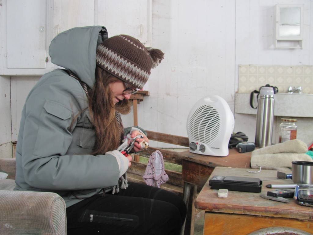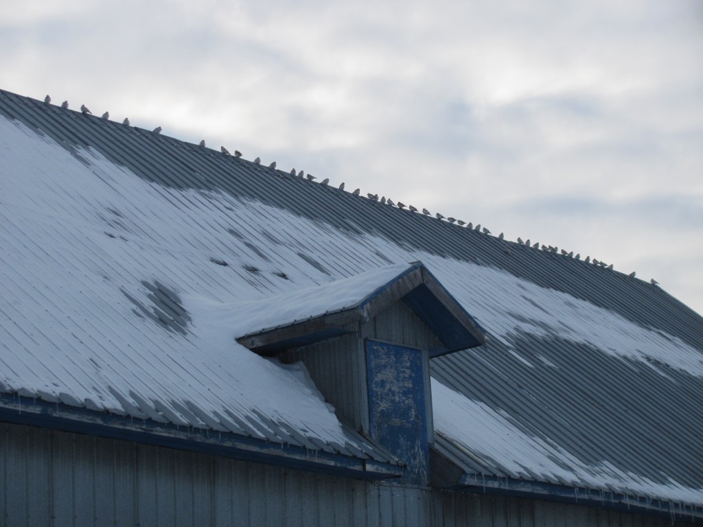 Joanne and I were able to get back to our old site from last year at the large dairy farm. We haven’t seen the hundreds of birds that we had last year, but there were still enough around that we thought we would try to band some this weekend. We finally had a warm spell (-5 celsius) on Sunday, so you can see we set up inside one of the open silos with our bands and data sheets. Jack, who you see sitting on the cotton seed, is key to our operation. He puts out the bait piles for us everyday and helps with the banding. Usually we place the ground traps on top of the horizontal silos, so from ground level it’s difficult to see if we have anything. From his vantage point atop the cotton seed, Jack can keep an eye on the trap for us.