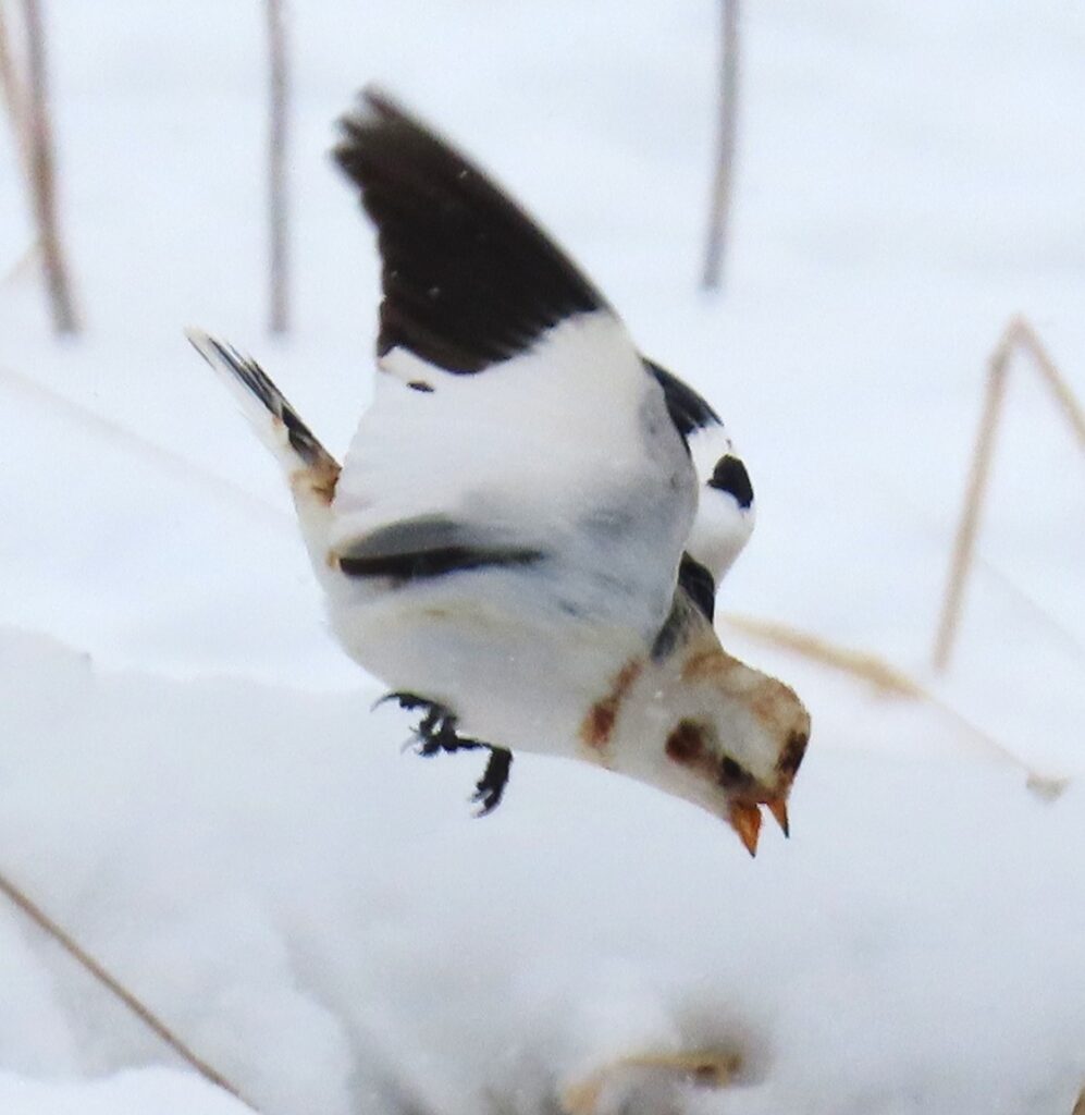 Lise Balthazar and her partner Nat live in Lanark County. Lise attracts large numbers of Snow Buntings and Nat, an expert photographer, takes some great shots of them….which Lise kindly passes on to me. I’ll post a few. Note that almost all of them are males – Lanark county is north and east of us….closer to the nesting grounds.