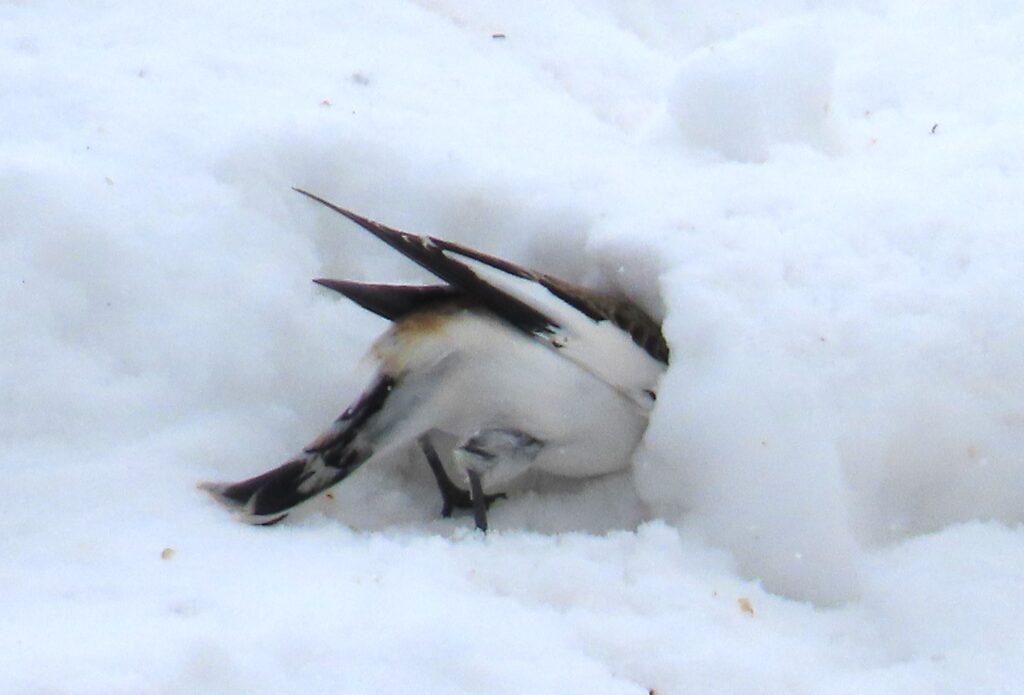 We’ve had a good run! Although Marnie’s Irish Line site produced 55 Snow Buntings over two days in the middle of December, we didn’t really get good Canadian Winter weather until the middle of January. And for about a month (starting on January 16th and running till February 15th) we were blessed with cold temperatures (sometimes bitterly so) and snow. Bunting weather! It’s still amazing to me how these little birds (weighing between 30-35 grams) seem to withstand severe cold elements with such ease. In fact, research carried out at the University of Rimouski by Francois Vezina has shown that the birds have much more difficulty dealing with warm temperatures than with cold.