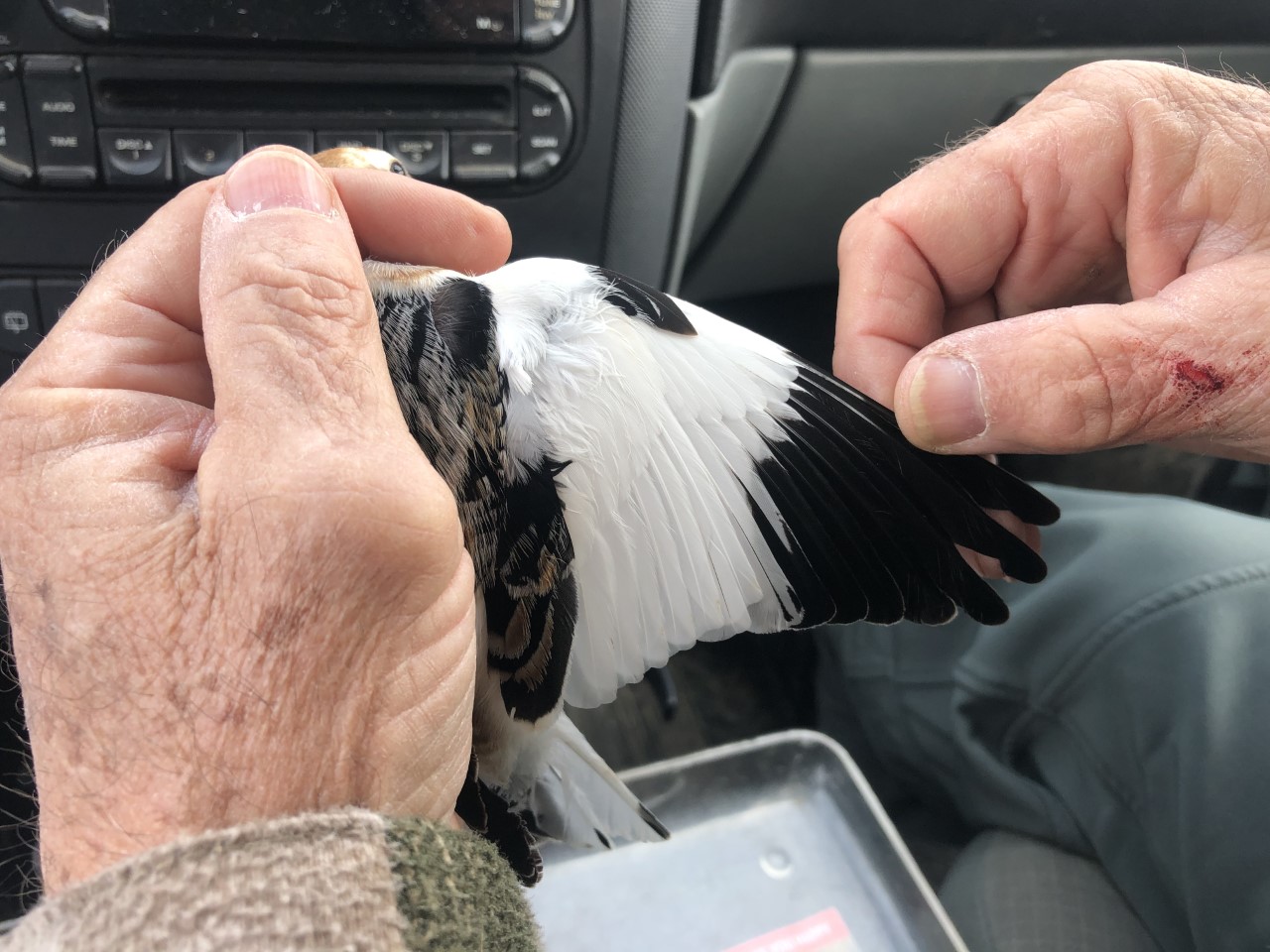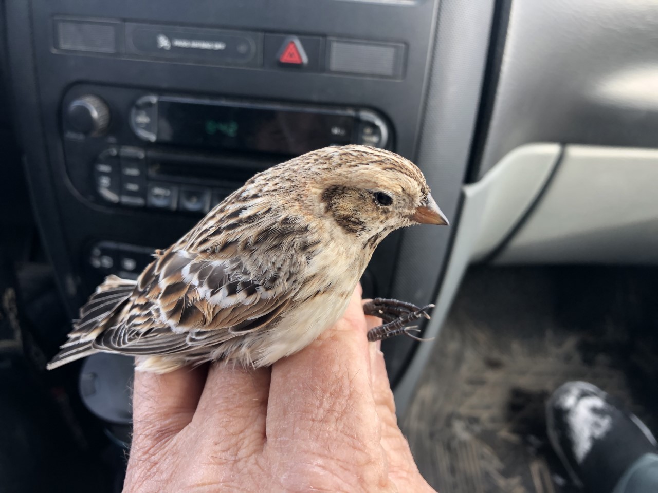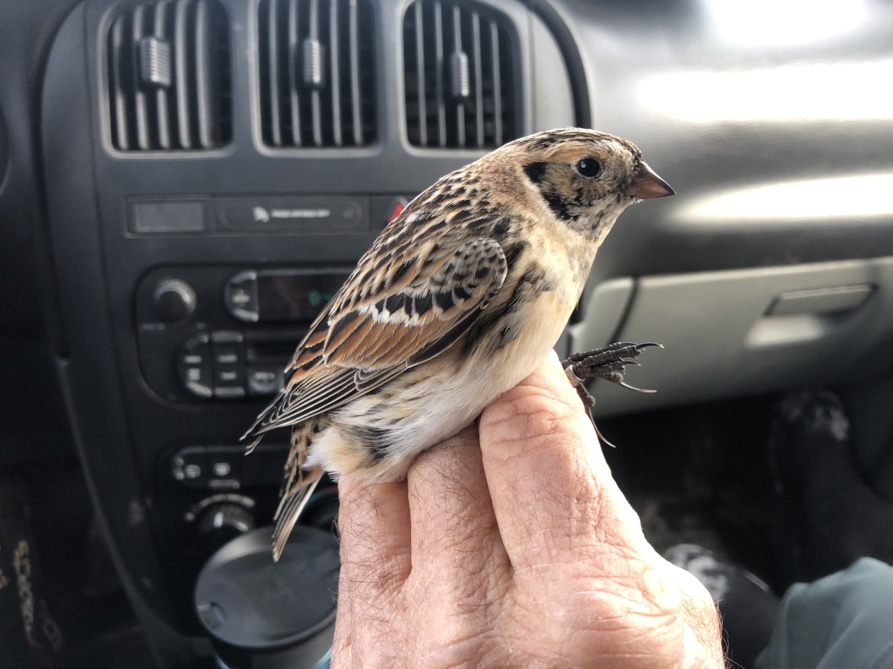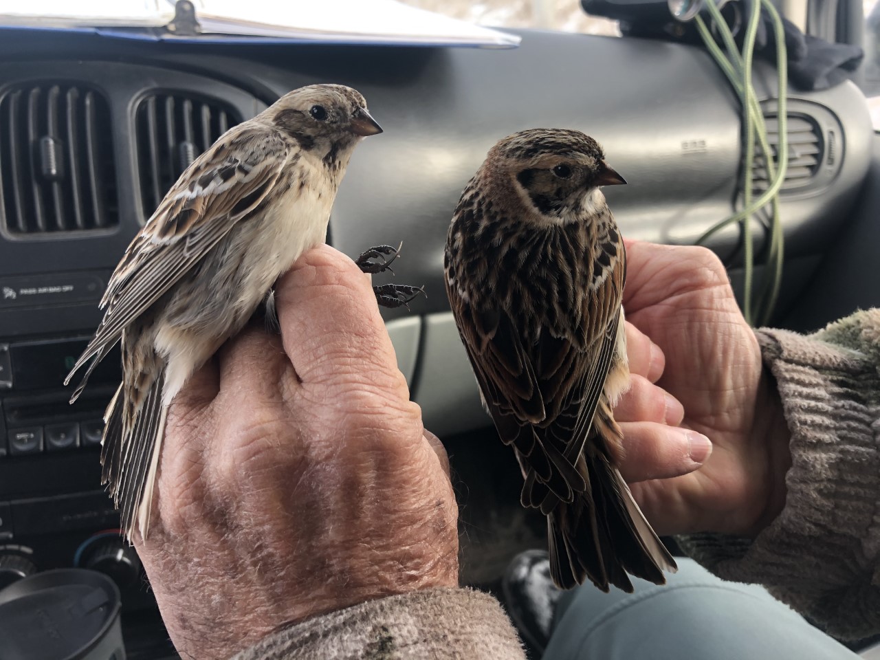 Our strategy of removing the traps in time to allow birds to feed unhindered proved to be a good one today. There were lots of birds in the bait area – there was one flock (at least) of 250+ birds. They were pretty flighty, possibly due to 2 male Northern Harriers working the local fields. Even so, we banded 50 birds: 44 Snow Buntings, 4 Horned Larks, and 2 Lapland Longspurs (first for the season).