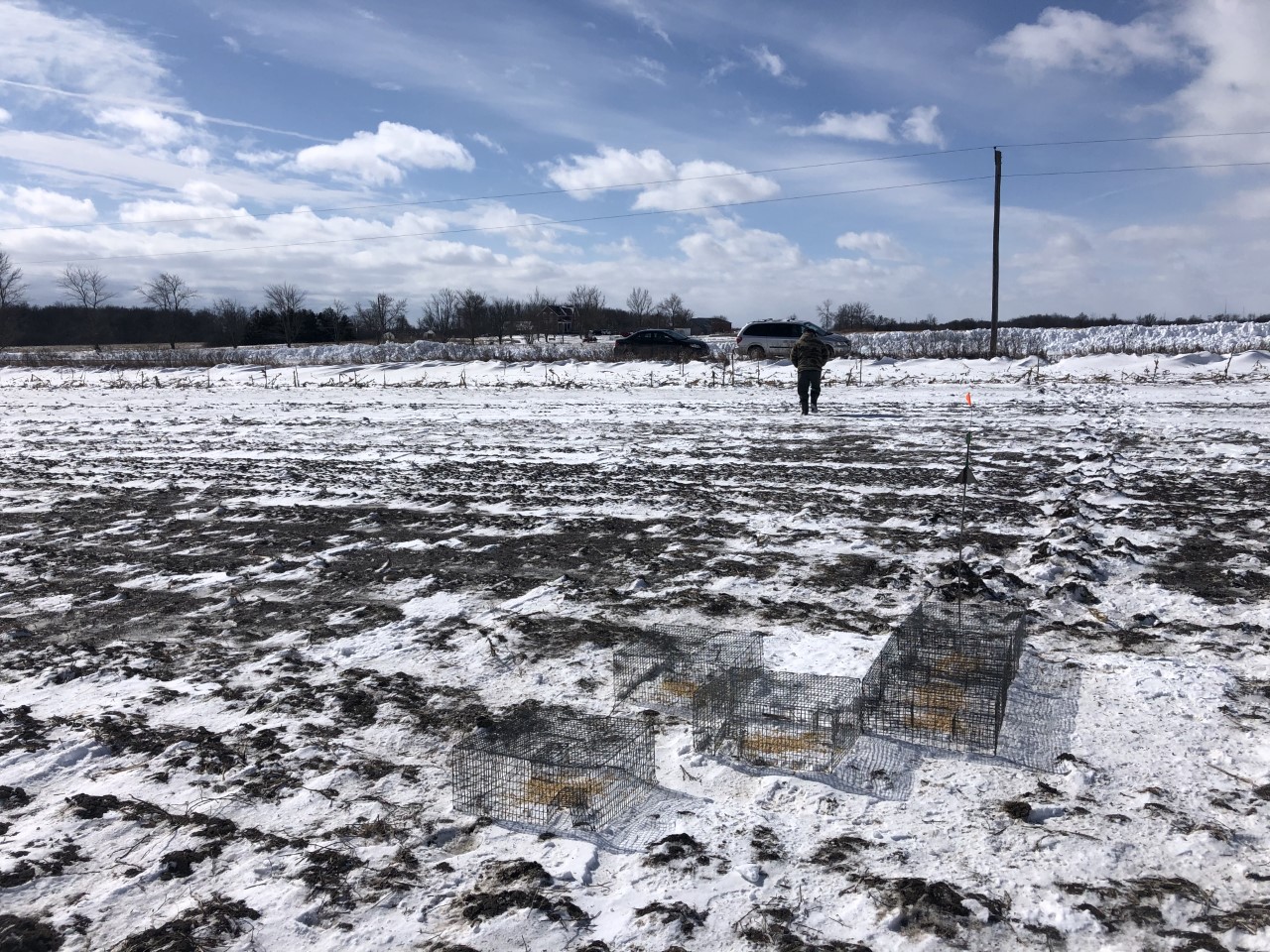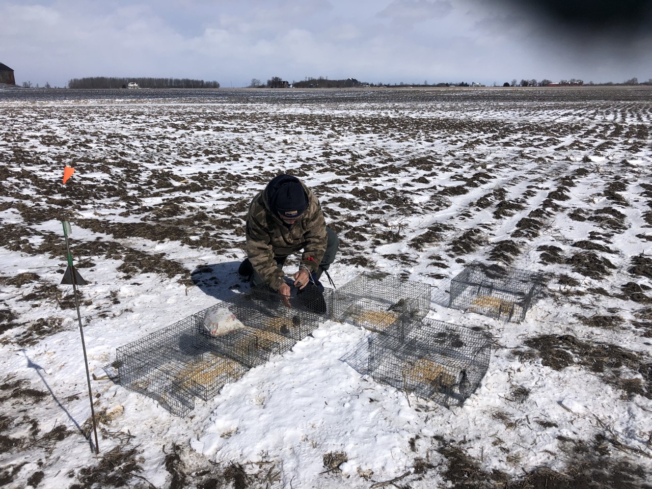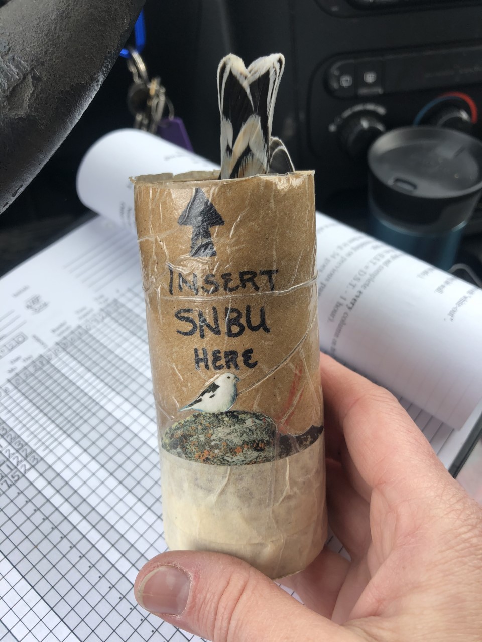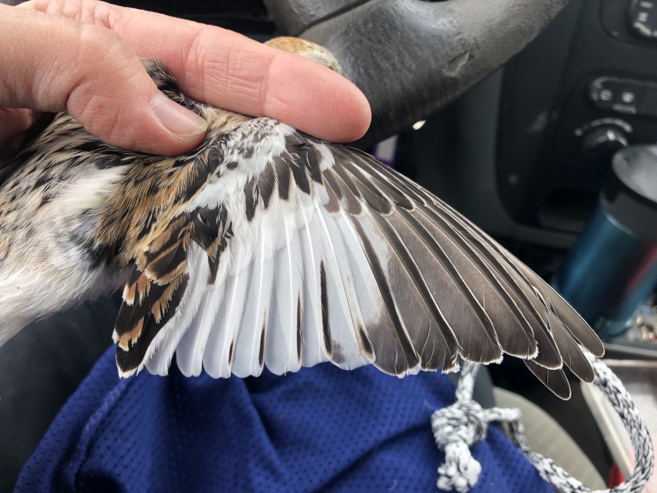 Our strategy of removing the traps in time to allow birds to feed unhindered proved to be a good one today. There were lots of birds in the bait area – there was one flock (at least) of 250+ birds. They were pretty flighty, possibly due to 2 male Northern Harriers working the local fields. Even so, we banded 50 birds: 44 Snow Buntings, 4 Horned Larks, and 2 Lapland Longspurs (first for the season).