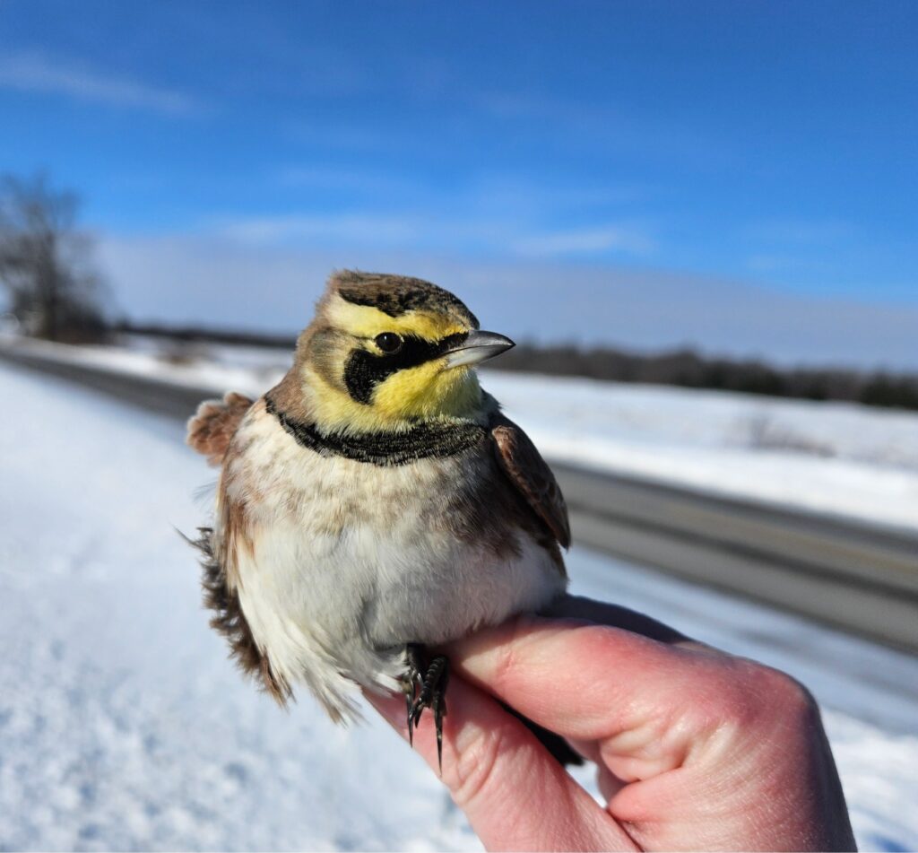 Later in the morning the pace began to drop off. But by this point we had banded 83 Snow Buntings and a Horned Lark and had handled 17 retraps (12 buntings and 5 larks). But not to be dismayed, we thought about heading over to Duncan and Marnie’s farm on Irish Line. My site is good….but Marnie’s is great. This would give us a chance to hit the bunting century mark for the day. Through the morning I had been watching cloud, heavy in the south over the lake, starting to build. Once we got to Cayuga a significant snow was falling and the SW wind had picked up considerably. Annika had a long way to go to get home and made the smart decision to head out. I decided to check out Irish Line (after all, Duncan had gone to a helluva lot of work to clear snow from the long driveway). By the time I got there a heavy squall was going on – I had a hard time even seeing the trees in the forest on the other side of the field. I set out 3 traps and 100+ buntings were immediately investigating them. I left them open for only 20 minutes but in that time they had filled halfway with blowing snow….and 12 Snow Buntings. Mother Nature was telling me it was enough for one day. I banded them and then headed home. It had been a very productive day.