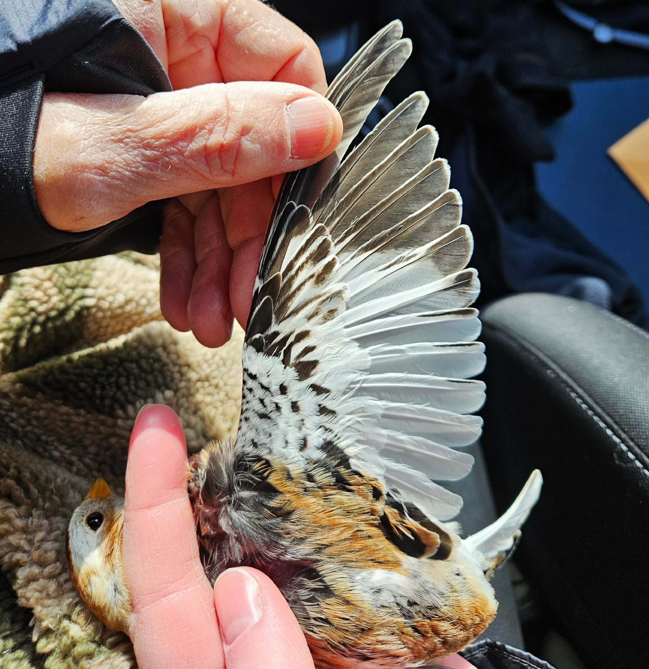 We would clear traps, band, clear traps, band….the only interruptions were caused by avian predators investigating the traps, alive with buntings. In one instance BOTH a Cooper’s Hawk and a Northern Harrier swooped in at the same time while in another instance just a harrier came by. Both were easily chased off and, unlike American Kestrels which will hang around in the immediate area (tree tops, hydro lines), fly off into the distance. Once they head off the buntings return quickly.