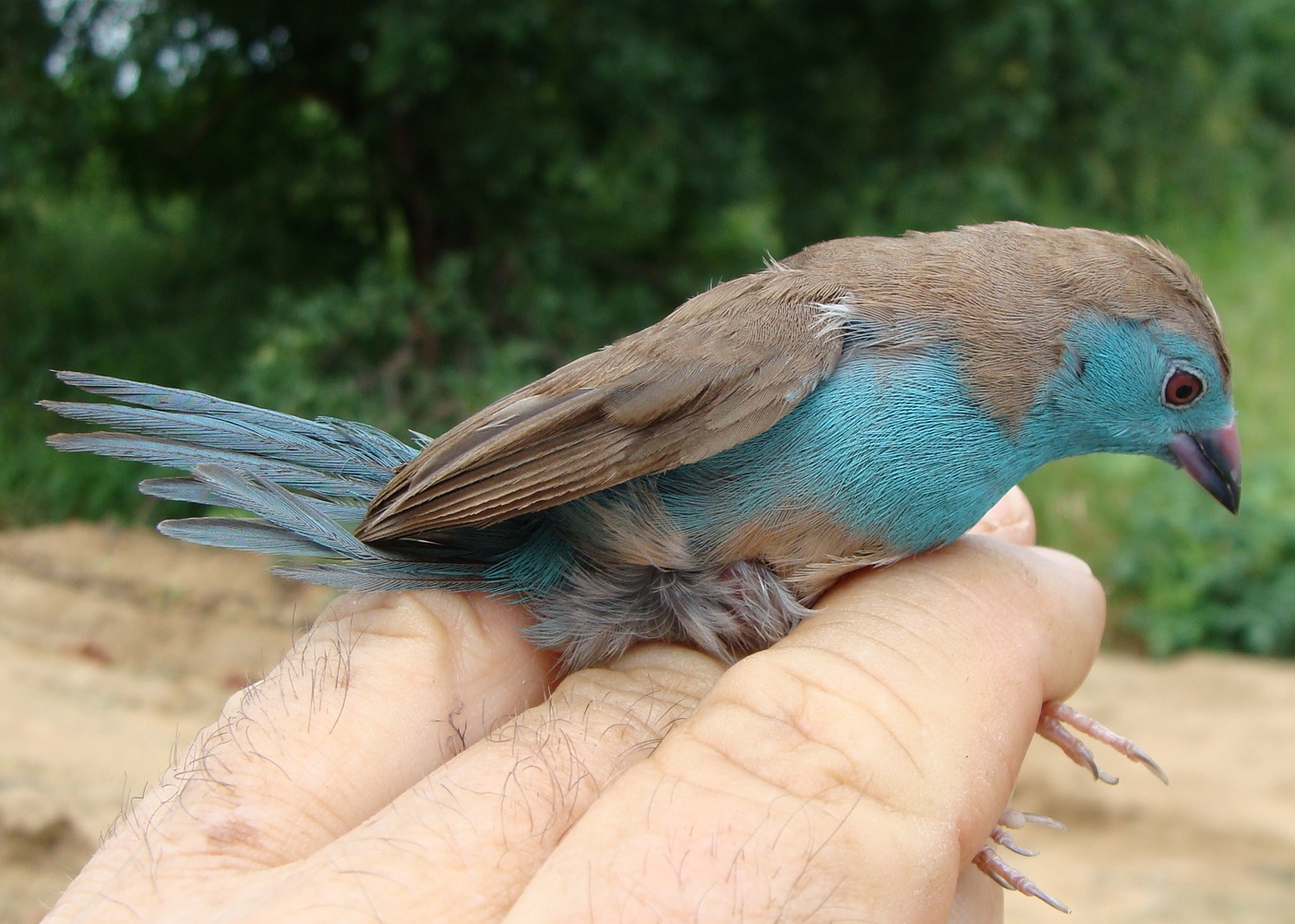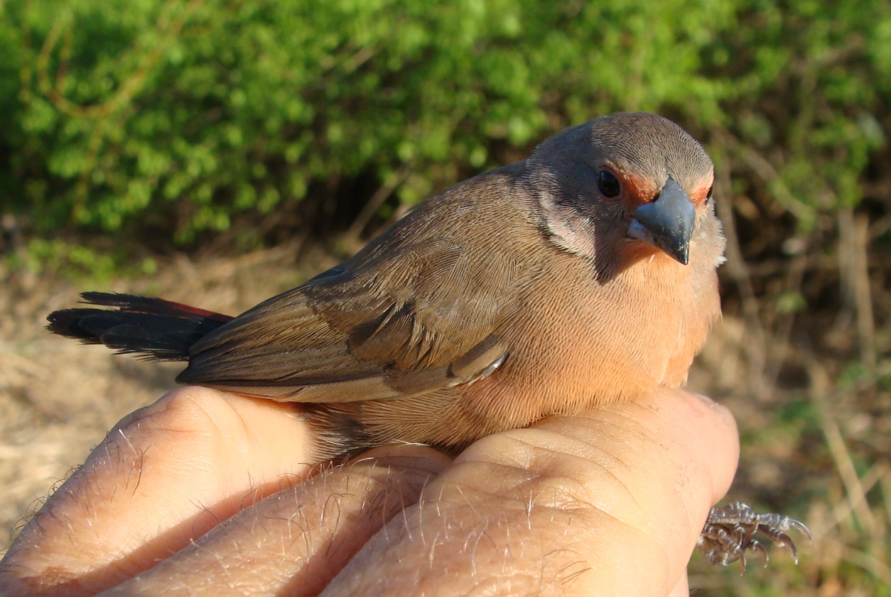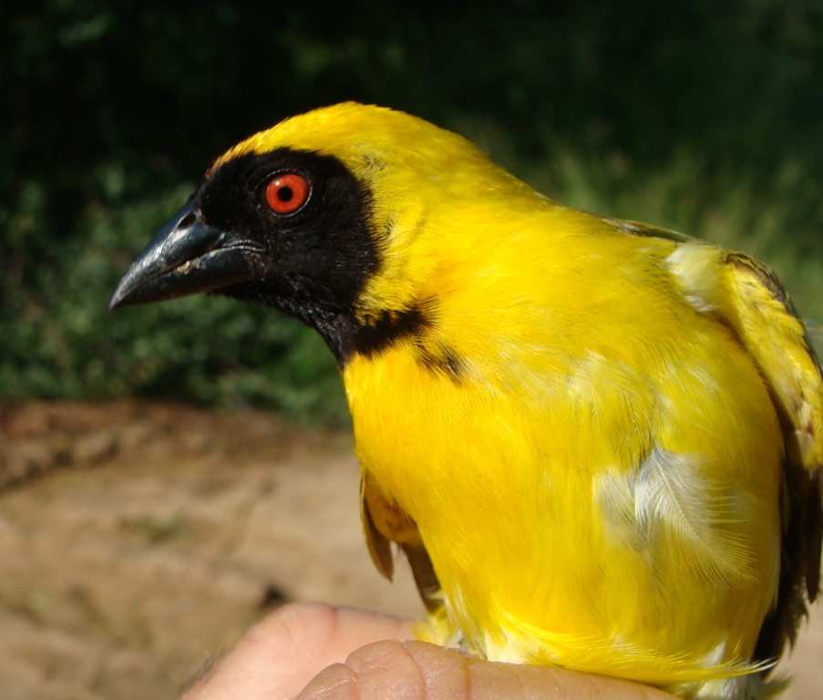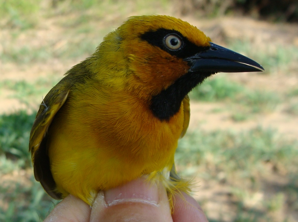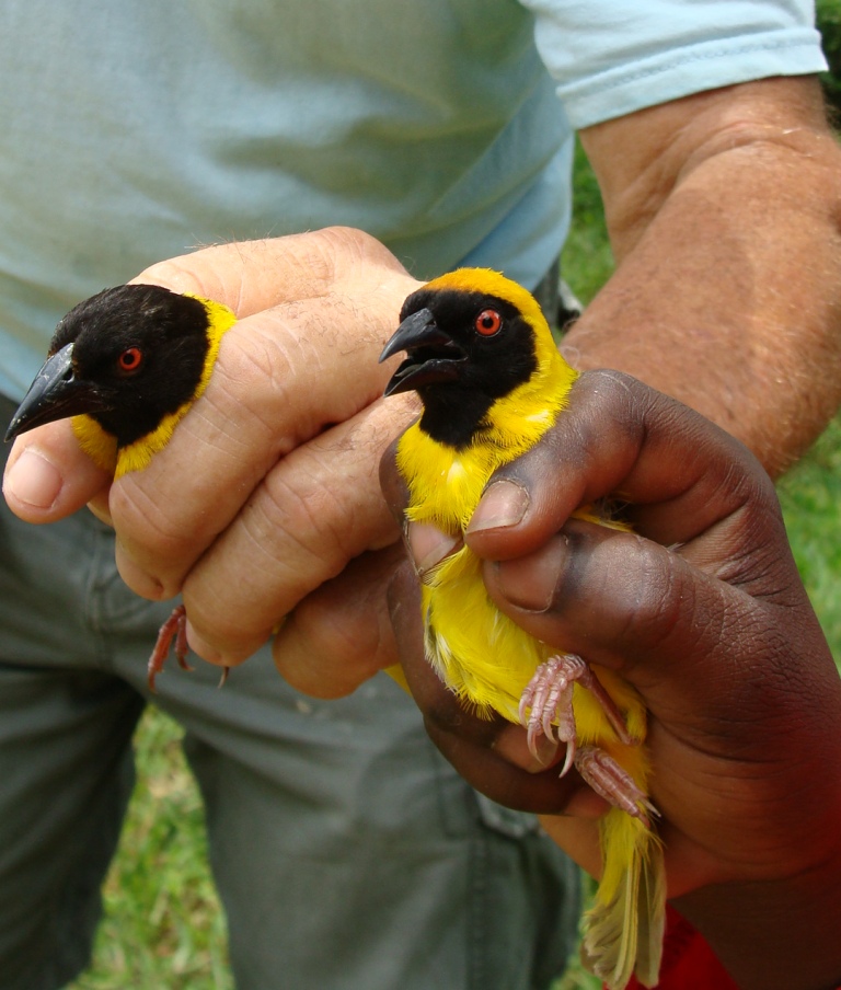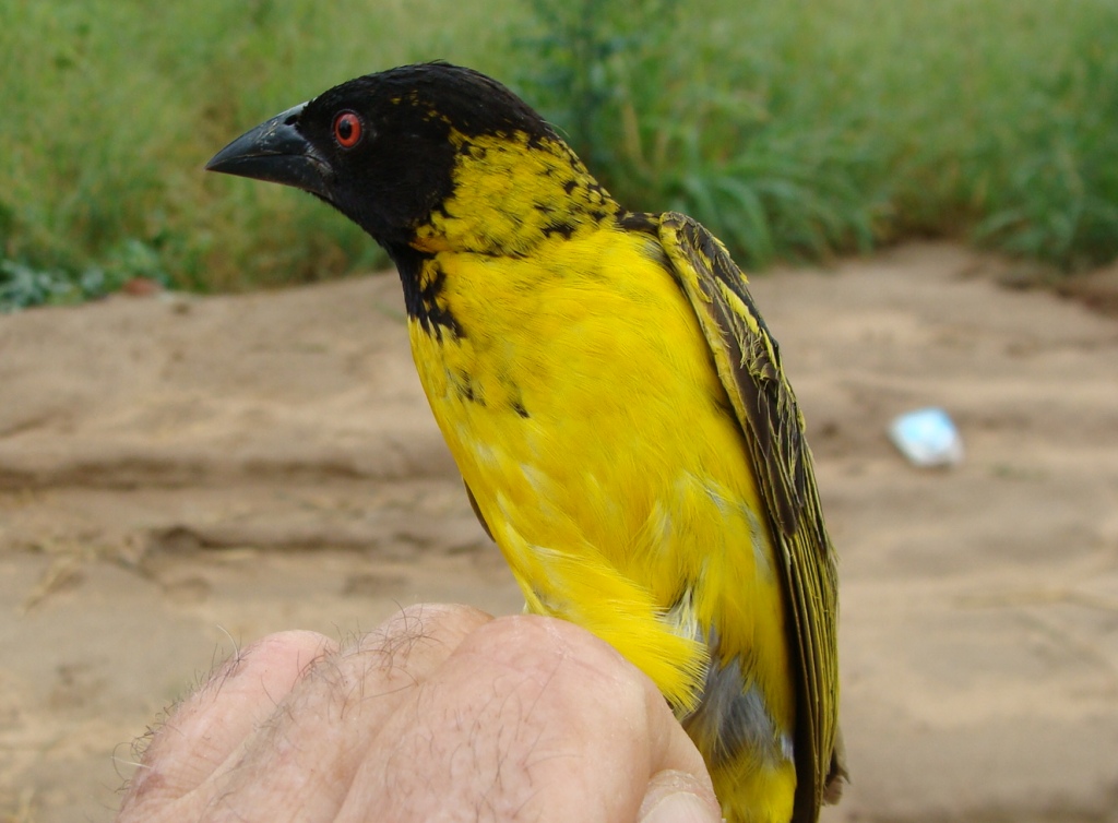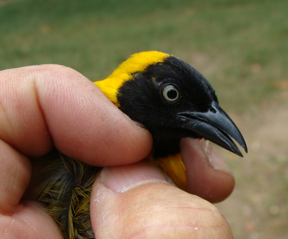 Banding in Malawi (as in Kenya) is a different process than I’m used to at Ruthven. At Ruthven we have set net lanes that we use from year to year knowing that migrants predictably are going to flow through at a particular time each year and will be using the “corridors” (edge habitat) where we set the nets. First of all, in Malawi there are a LOT more birds around, migration or no migration. And where they are and when they’re there is dictated by the rains which can be quite variable. They can start early, or late, last a long time or not long at all, drop a lot of water or, in bad years, hardly any or none at all. So I set my nets based on observations of where the birds are at any particular point in time assessing why they’re there. Usually it’s because of a concentrated food source or an abundance of nesting material. The thing is: these are not constant and can vary from day to day (if not hour to hour – when the fruit on a particular tree is used up then they need to find another tree). Also, birds soon learn where the nets are and begin to avoid them. Consequently, I would move my nets every couple of days and place them where I thought I would get a day or two out of a resource. Fortunately, I was using only 2 nets so this wasn’t a big deal (other than clearing the lanes). The reason for using only 2 nets is that I was worried about a couple of things: a big hit (e.g., a wandering flock of weavers or mannikins could involve a lot of extraction); I didn’t want birds to be hanging in the nets in the heat of the day (on a couple of days the temperature soared into the mid-40’s by mid-morning); I was concerned about predators – birds and, especially, snakes (I encountered a sizeable [1 meter] Green Mamba coiled up atop a shrub next to a net lane – it would be attracted to any bird in distress and I certainly didn’t want to have to try and extract this very poisonous snake- especially when anti-venom wasn’t available).