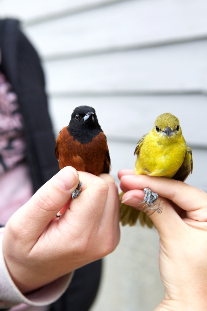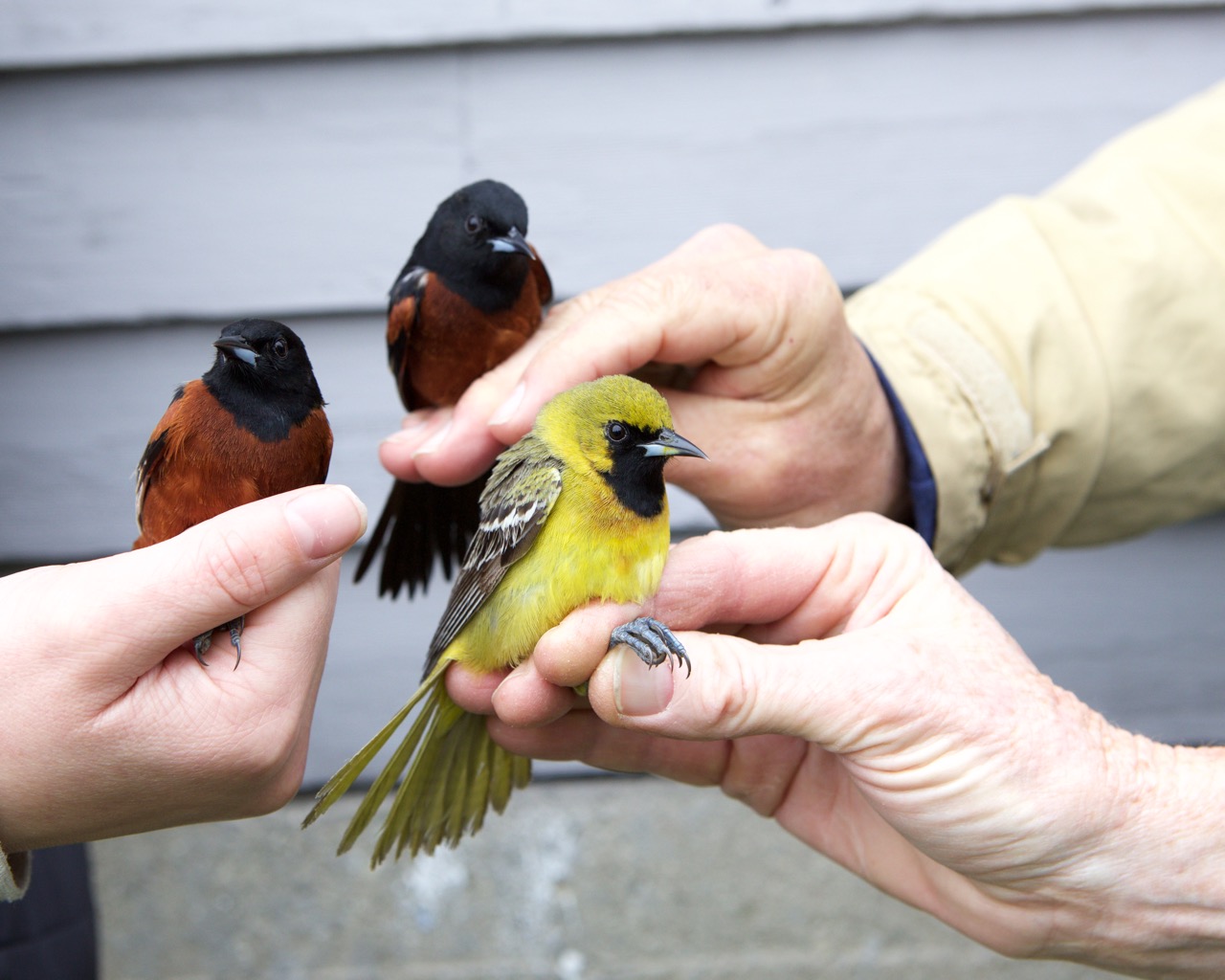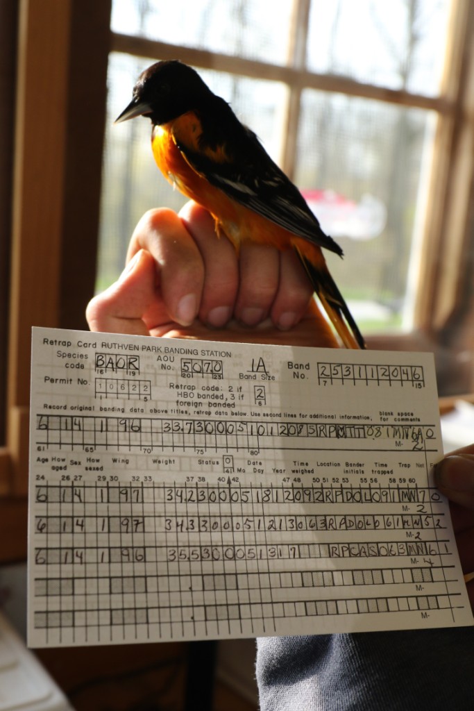 One of the most interesting things about Spring banding is the recapturing of long-distance migrants that were banded here in previous years and have returned to their Summer home once again…..like this male Baltimore Oriole which is at least 7 years old.
