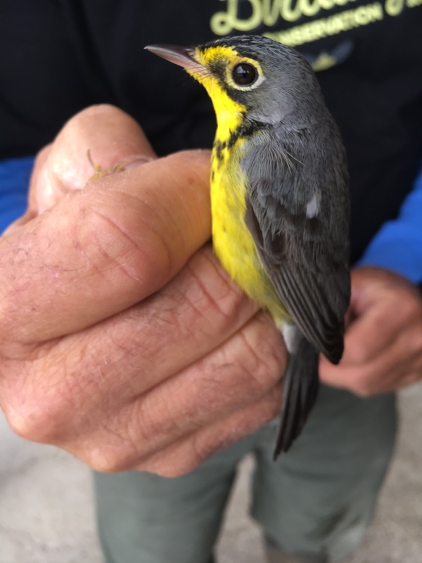 Cloud moving in early this morning with light, intermittent showers brought migrants down to earth over much of the western end of Lake Ontario. This “fallout” was witnessed both at Ruthven and Fern Hill Oakville. At Ruthven, Mike (and Jaimie) handled 93 birds – 72 of them newly banded. And at FHS-Oakville we handled 43 with 28 newly banded. But at Oakville the most noticeable thing was a species count for the day of 48 – by far the highest total we’ve had there. This included 7 species of Warblers (Canada Warbler being the highlight!).