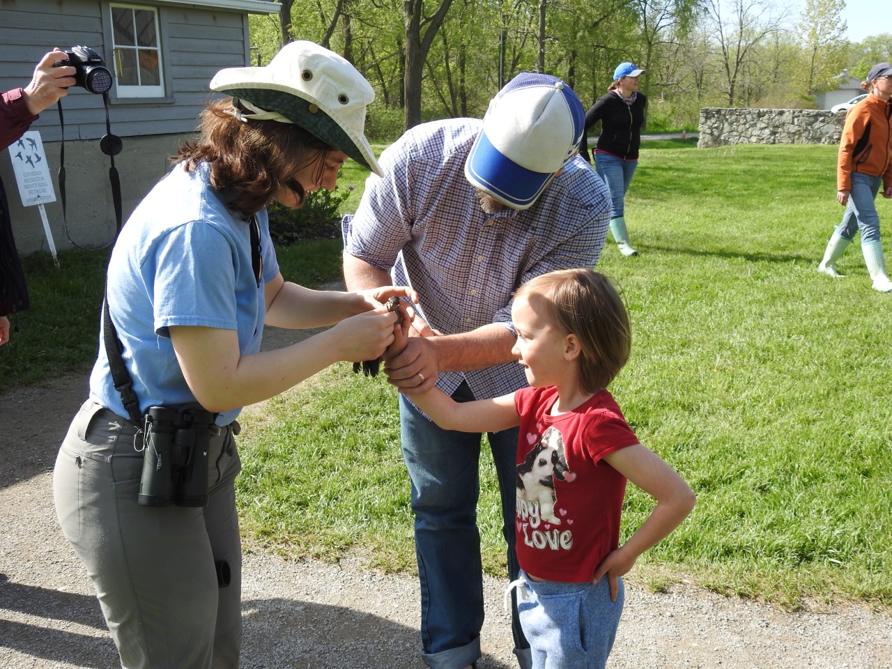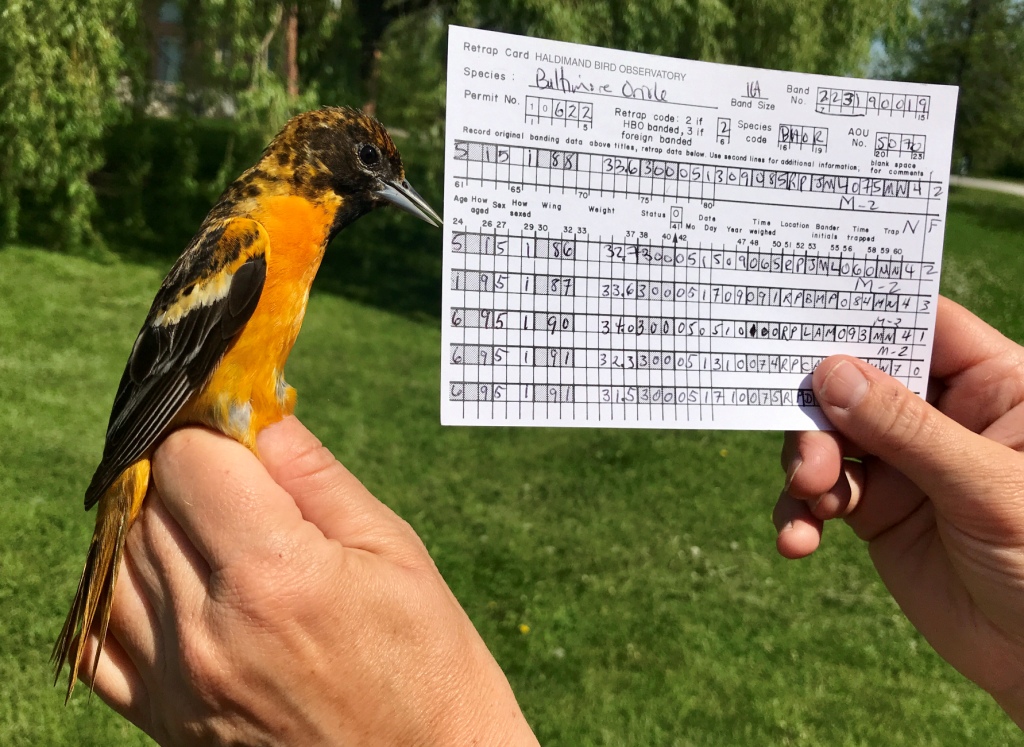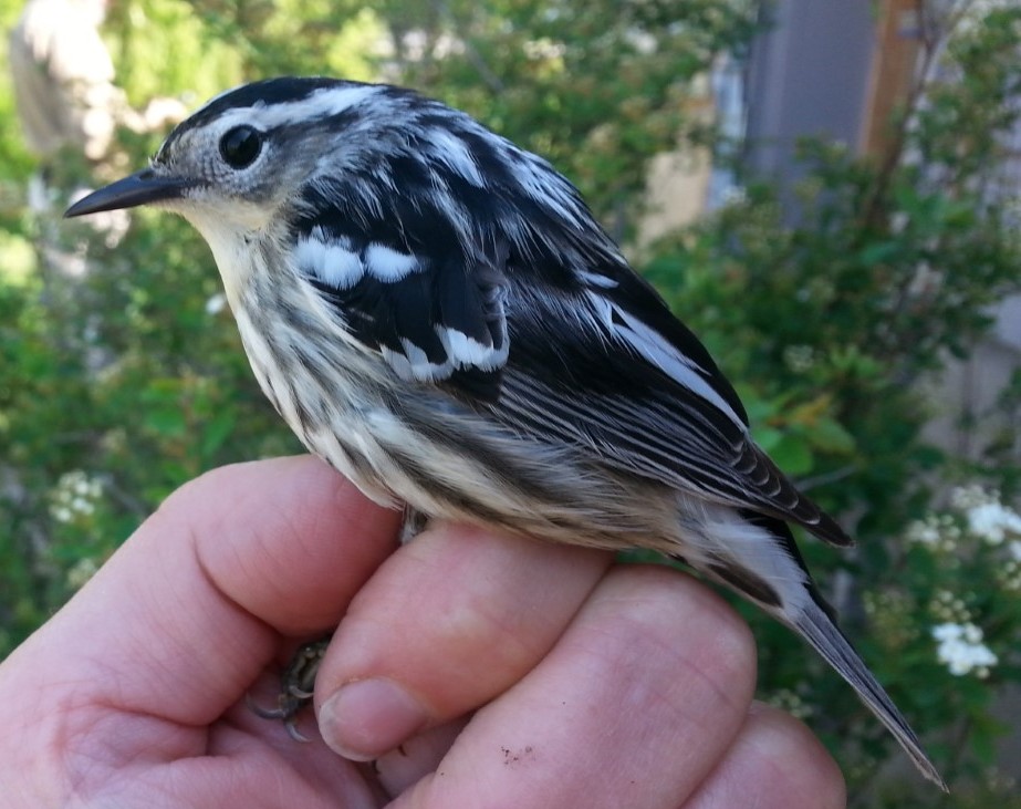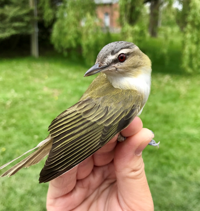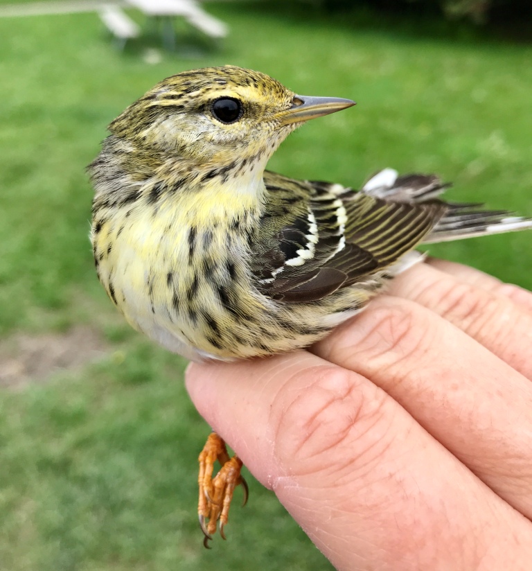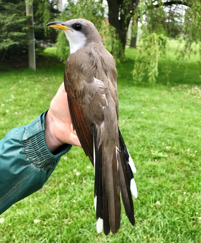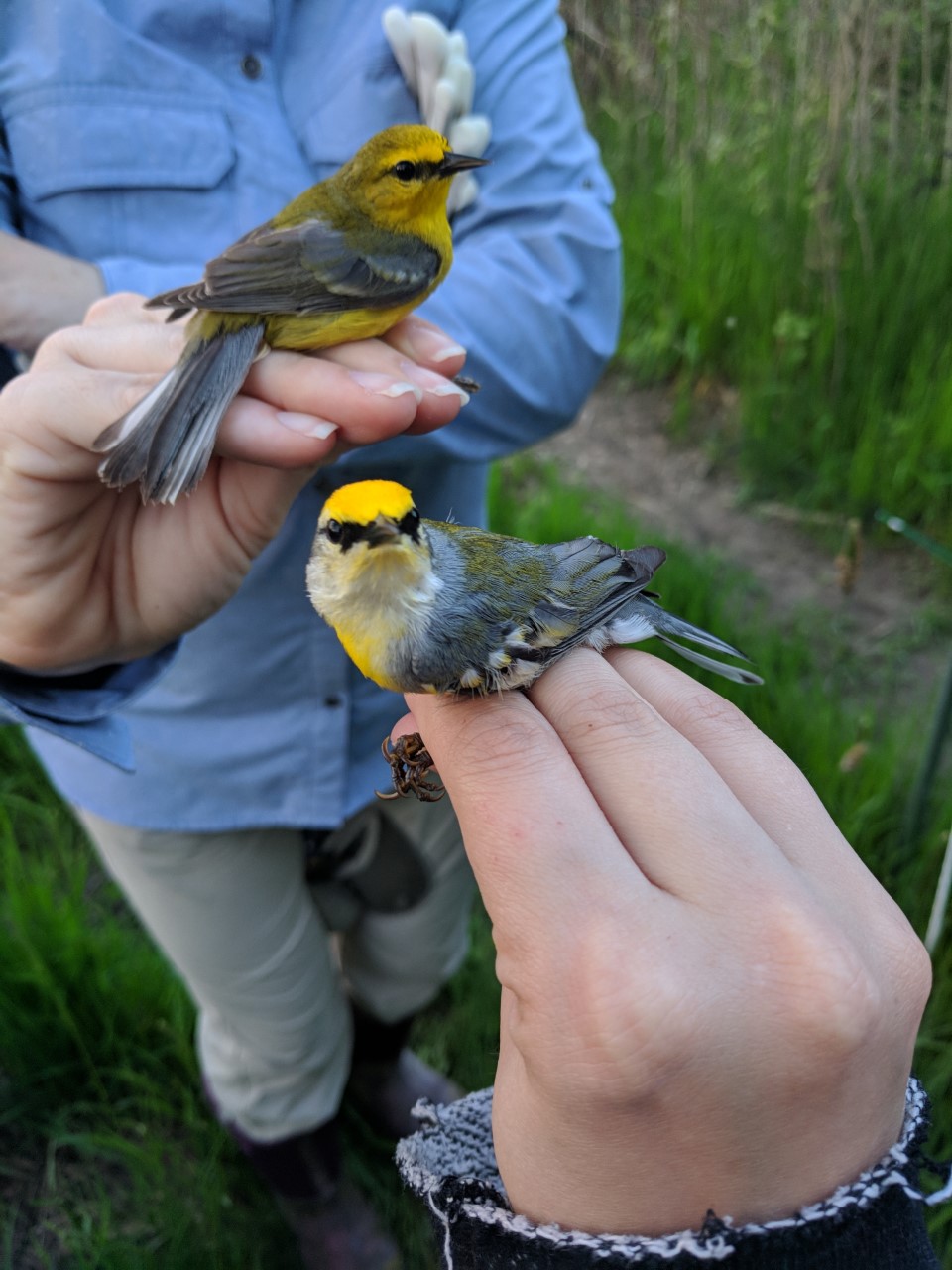 We had a good day with the overcast weather and intermittent showers. We handled a beautiful mix of warblers, plus a variety of other species that ranged in size. The species that we could hear or see around the banding lab and along the net lanes included cuckoos, warblers, orioles, Cedar Waxwings and our colony of Purple Martins just to name a few!