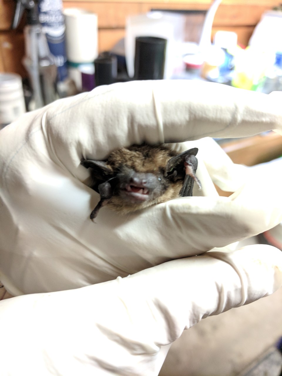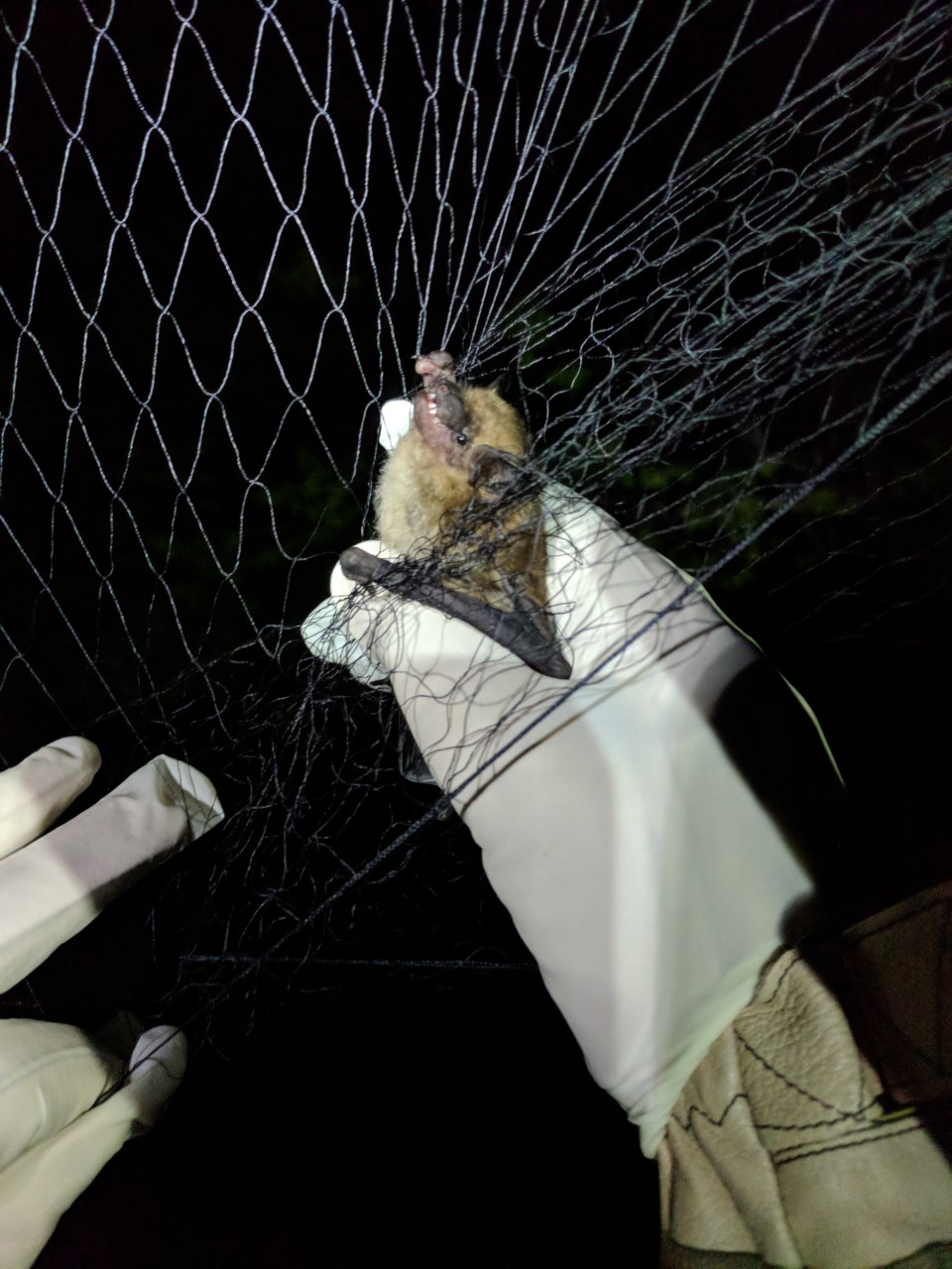 Michelle Karam visited tonight with 2 of her students to try and catch and band bats. Sian Ford and I tagged along (me just until it got dark….something to do with the need for beauty sleep…). While waiting for it to get dark Sian opened Net 7 in the hope of netting some of the Common Nighthawks that were flying around. The nighthawks were too high but she did get a new Brown Thrasher and 2 retrapped Brewster’s/Blue-winged Warbler, a male and female, probably a mated pair. Later Michelle did get a bat – a Big Brown Bat – and banded it.