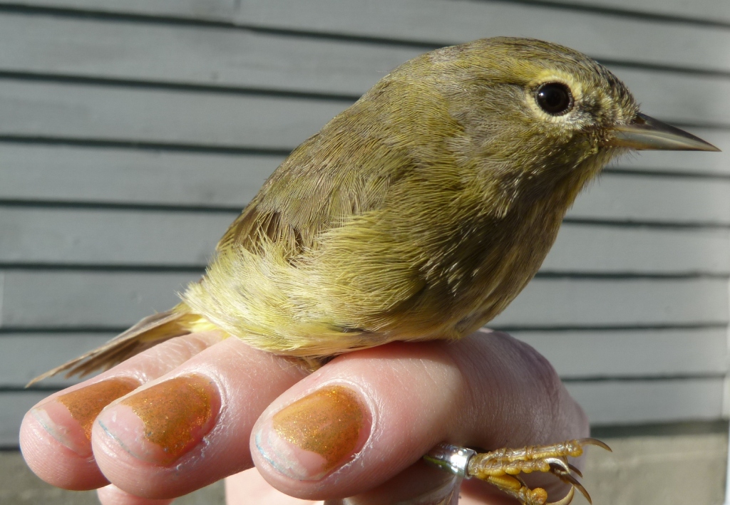 We rarely see Orange-crowned Warblers in the Spring, so catching this female was a treat. We are much more likely to get them in the Fall, but never in big numbers.