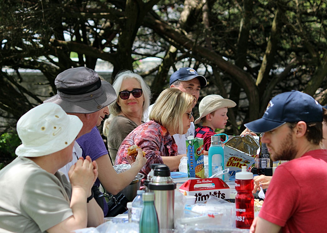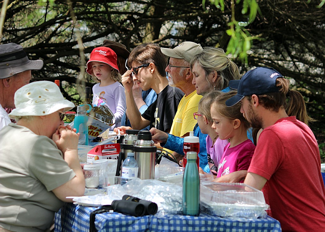 As I have tried to impress upon all of you, a banding lab runs on its stomach, much like Napolean’s armies. Many of you have taken this to heart and brought a wide assortment of goodies. Not only does the food fuel our energy reserves but food seems to bring people together and helps generate a warm atmosphere – making the banding lab an even better place to be. Thanks!! Dave Maida decided we were long overdue for a picnic….and he was right. So he advertised he was doing one of his famous fish fries and invited others to jump in: Irene brought an assortment of her splendid baking, Carol came with her famous rhubarb pie (complete with thick meringue), Laura kicked in a wide array of veggies with dip (perfect for the only vegetarian), and so it went. But it was Dave that contributed the lion’s share: fresh fried perch (caught when ice-fishing on Lake Simcoe), venison sausage (from a hunting foray), bacon-wrapped grouse (from another foray), macaroni salad with tuna (that I had caught in the Grand River). What a wonderful time! If you weren’t there….you really missed out. But feel free to start another one. I will readily contribute my appetite.