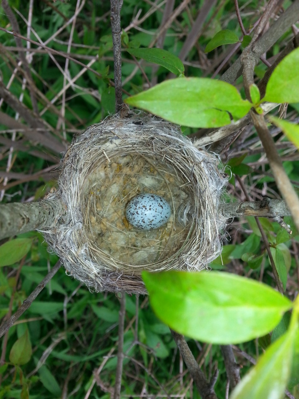 So many birds have come all this way to nest. And Brown-headed Cowbirds have been waiting for them so they can deposit their eggs in the migrants’ nest and have them raise young cowbirds – often to the great detriment of the host bird’s own young. We have been asked to look for evidence of this “nest parasitism”. Nancy found a new nest with a cowbird egg in it. We’re not sure of what species built it. Chipping Sparrow? Yellow Warbler? Just not sure.