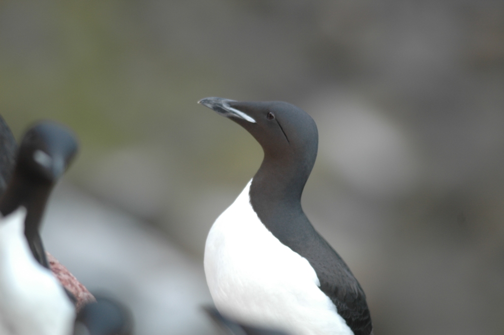 I have a bit of time on my hands out here on the Newfoundland coast, tied up at the dock awaiting repairs on the vessel before continuing the oceanographic research mission – with me as seabird observer. And I began to muse about the bill stripe running along the upper mandible of the Thick-billed Murre. [Now that’s a strange musing I can hear you thinking….why that!? Why not the meaning of life or American Thanksgiving football scores or the idiocy of the Trump presidency or women…..? I don’t know; it just happened to be this stripe.]