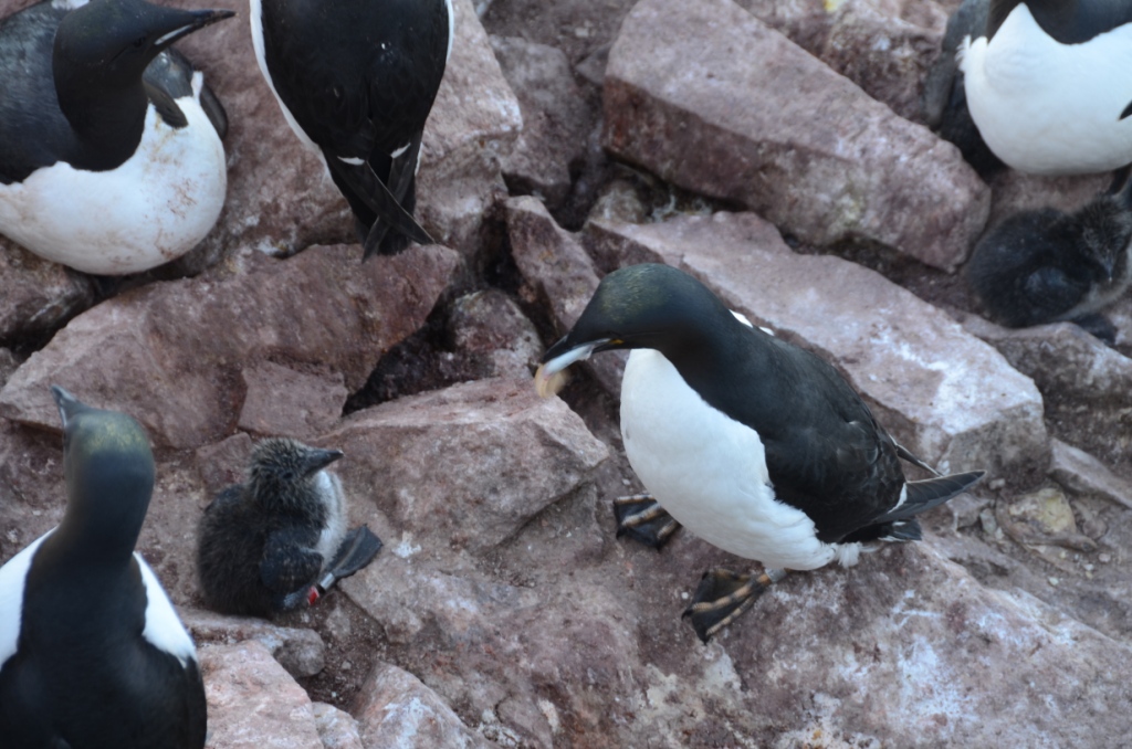 In Svalbard (and I would imagine most murre colonies) kleptoparasitism by jaegers (in my colony’s case Parasitic Jaegers) is common. Now provisioning a chick is hard work for a murre. Their wings aren’t really designed for elegant flying, twisting and turning, etc. They’re dual purpose appendages: to fly directly from the water to wherever in direct flight or to fly underwater to catch fish. Once they have caught a fish they have to beat their wings hard and fast to get enough lift to get up to the cliffside to pass it on to their progeny. It’s difficult and energy-consuming work. If they’re pursued and harried by a jaeger to the point that they’re forced to drop the fish, they have to start all over again – the chick doesn’t get fed and the adult uses up extra energy to resupply. And in bad weather conditions this could be deadly.