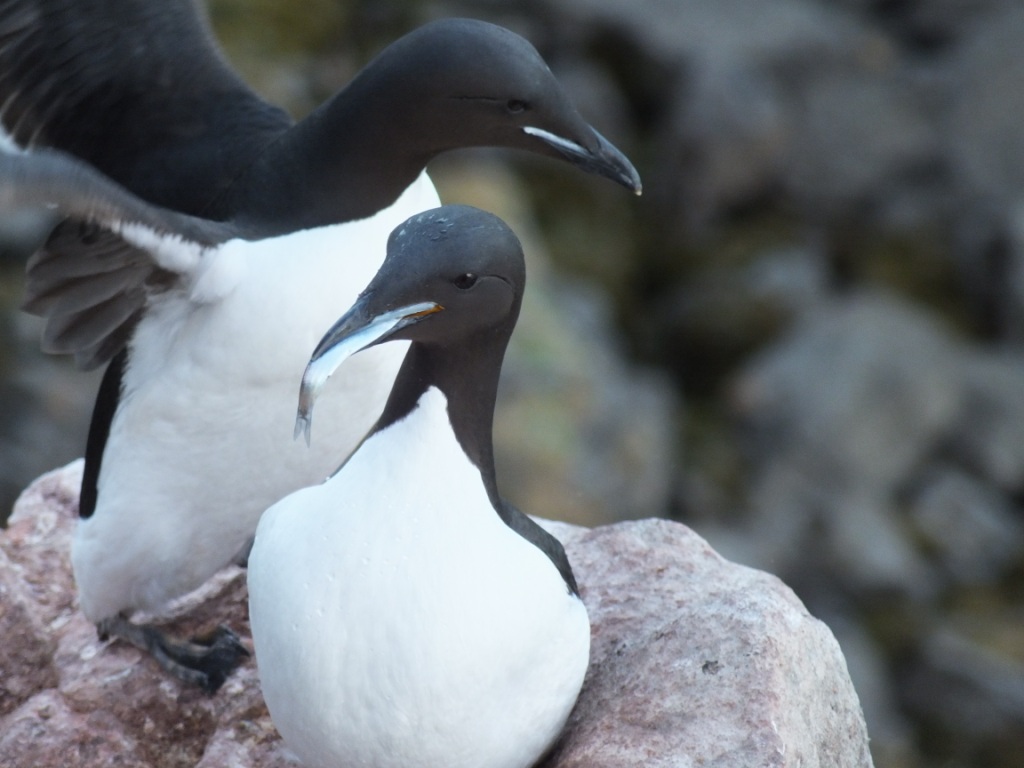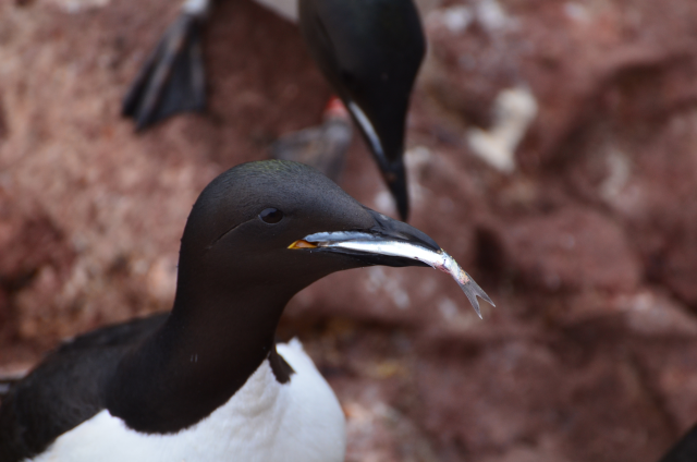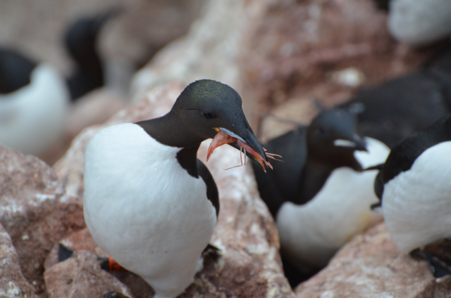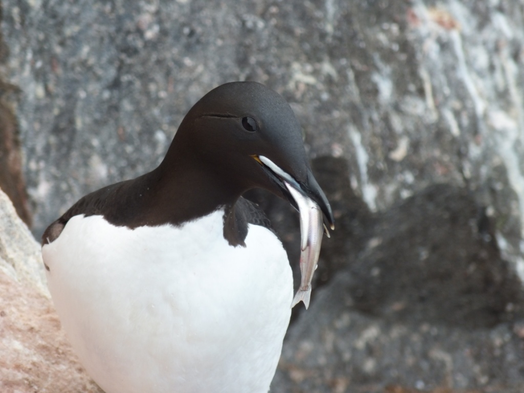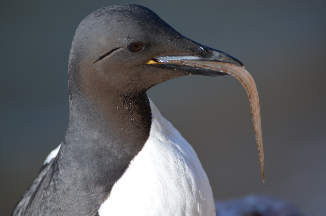 But getting back to my question…..why the white stripe. When chicks hatch parents take turns flying to fishing areas and bringing back their catch. You’ve probably seen pictures of Atlantic Puffins that bring fish back to their young – they carry the fish (sometimes 2 or 3 fish) cross-wise in their bills. Thick-billed Murres don’t; they carry a single fish lengthwise with the head in their throat and the tail, if the fish is big enough, protruding beyond the end of their bill. I was wondering if the two were connected; i.e., the white stripe and the fish carried longitudinally.