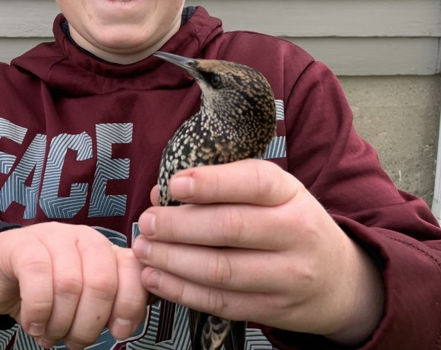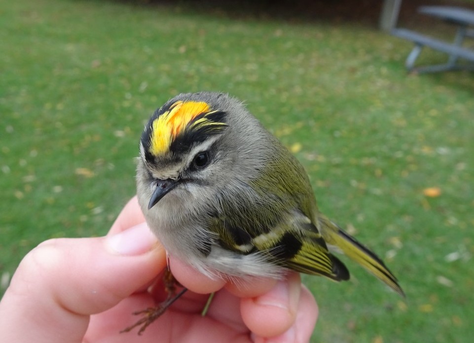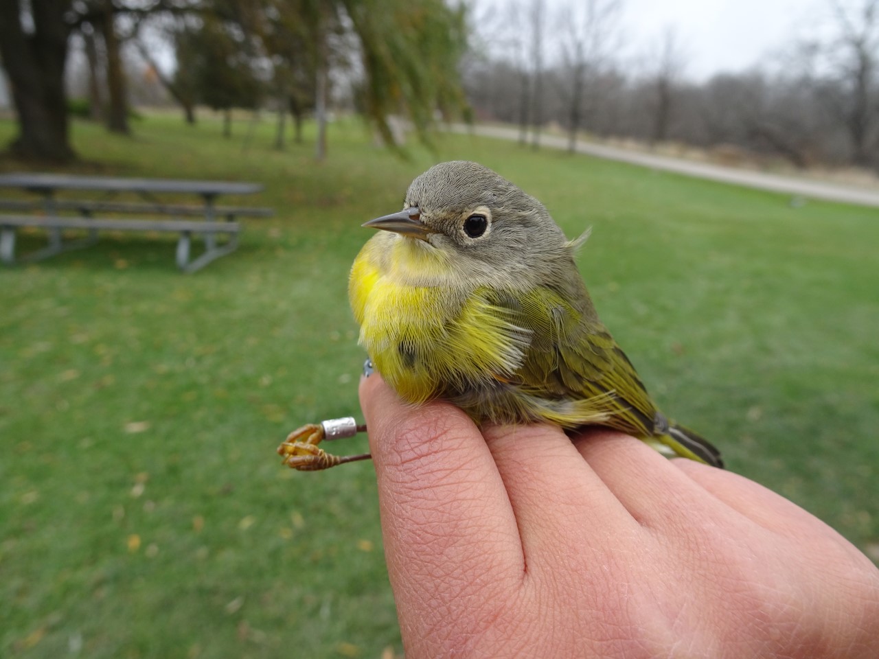 It was windy and cold on Saturday and cold and windy on Sunday although we got something of a reprieve Saturday night when the wind dropped. Late Winter residents are still on the move and we’re still getting a few late migrants. There are foraging flocks of a variety of species moving through the site as they strip patches of food wherever they find them: flocks of robins and waxwings in our hackberry trees and dogwoods (where they are joined by blackbirds and starlings); American Goldfinches whirl through and over the meadows taking advantage of the lush crop of goldenrod seeds that we have. Sometimes they get close to the nets and we catch them but more often than not they pass them over and we can only watch (and count).