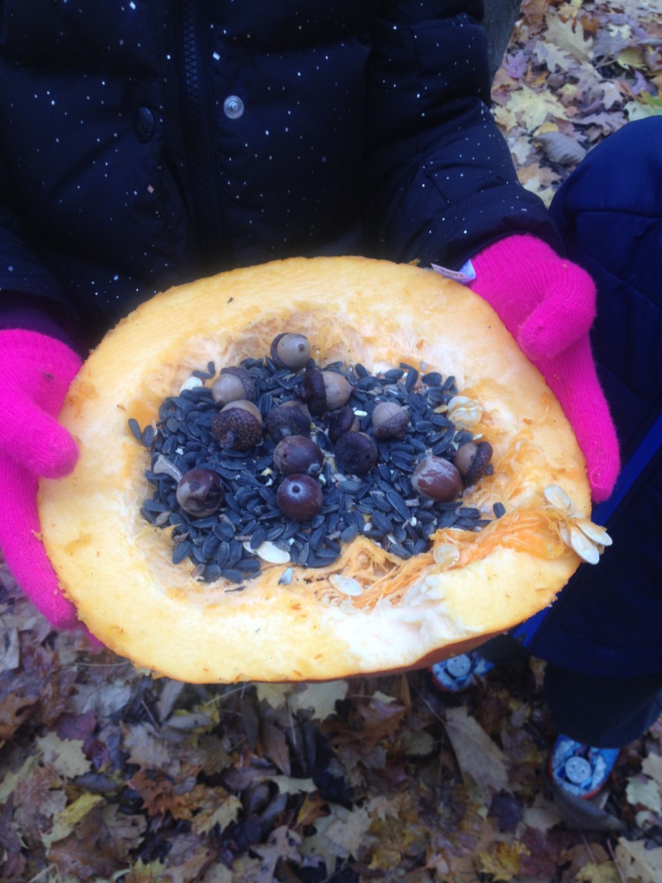 A very cold start to our day in Burlington, and in fact I had my first snowy drive in of the season. Winter is definitely on the way! We were hoping to see Juncos and Tree Sparrows today, but the feeder area was surprisingly quiet considering they were full of sunflower, Niger, and mixed seed. We have been observing Eastern Bluebirds in the area around the nest boxes throughout the Fall and today we could hear them singing despite the cold weather. Today my students and I collected and recycled leftover jack-o-lanterns and turned them into bird feeders.