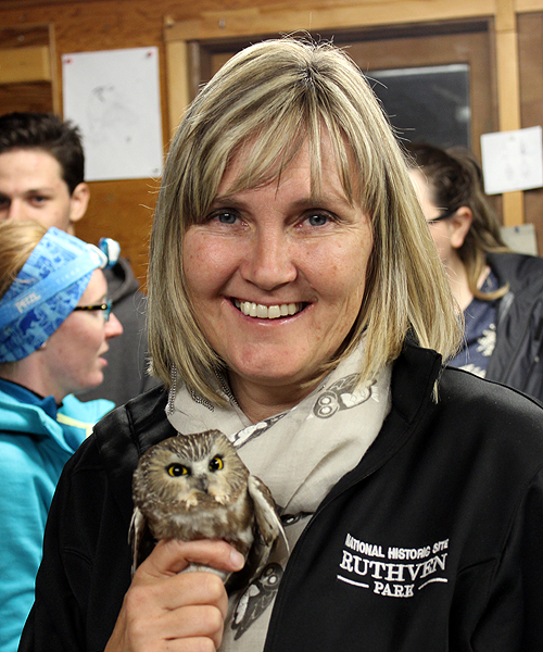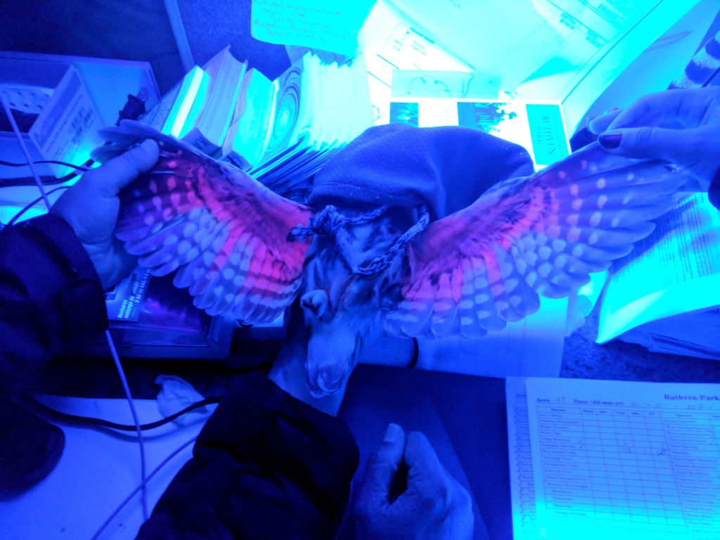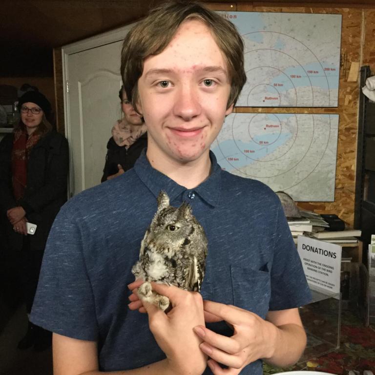 It’s been a busy, hectic few days with lots going on, interspersed with bouts of bad weather (today, for example, being a washout). On the 2nd Fern Hill Oakville’s Grade 2’s visited the Ruthven banding program (and house tour). We were fortunate in having lots of birds to keep everyone happy, handling 67 (37 banded, 30 retraps). In contrast, the 3rd was really slow at Ruthven (we banded only 8!) but, interestingly, busy at Fern Hill in Burlington – they banded 21 including a rare (for this area and time of year) White-eyed Vireo. That night we had an open-to-the-public owling session and pulled in 5 Northern Saw-whet Owls and retrapped an Eastern Screech Owl that we had banded about 2 weeks before. The 4th was busy again – it’s a topsy turvy time of year for bird movement – and we banded another 59. And, as I mentioned, today, the 5th, was a write-off. So as it stands now we have banded 2,838 birds this Fall in our “standard” banding operation and another 260 in our “non-standard” operations for a total of 3,098 birds!