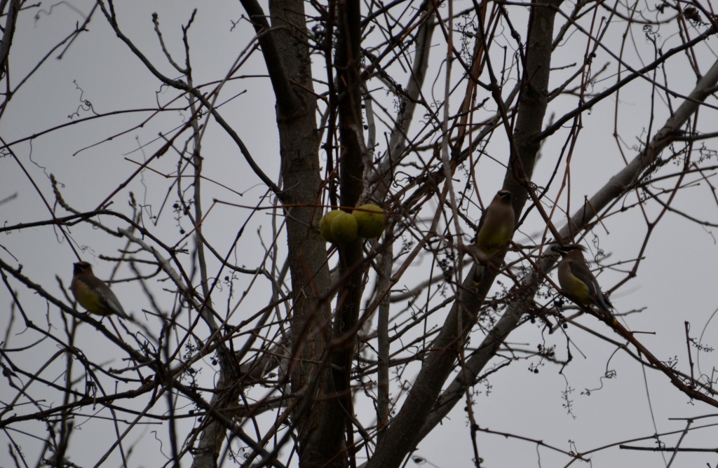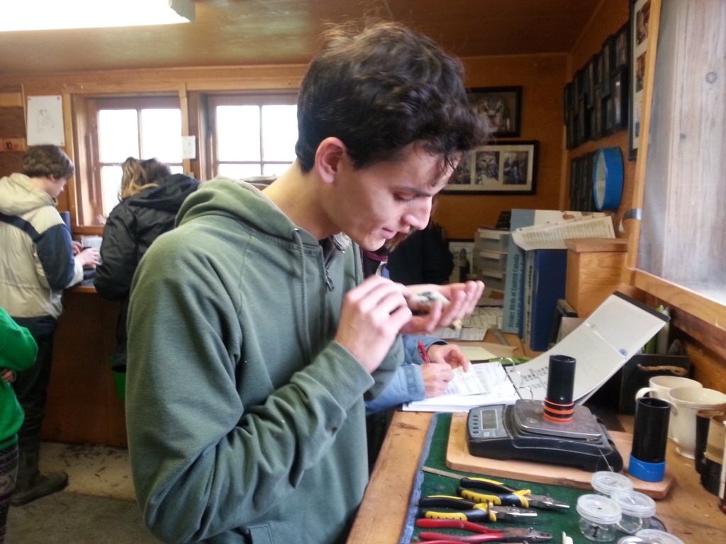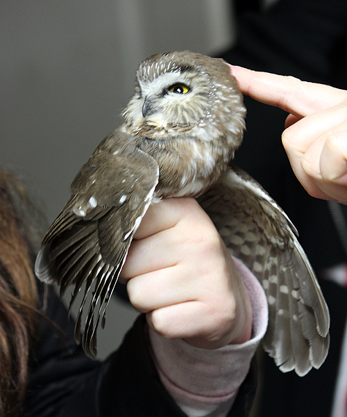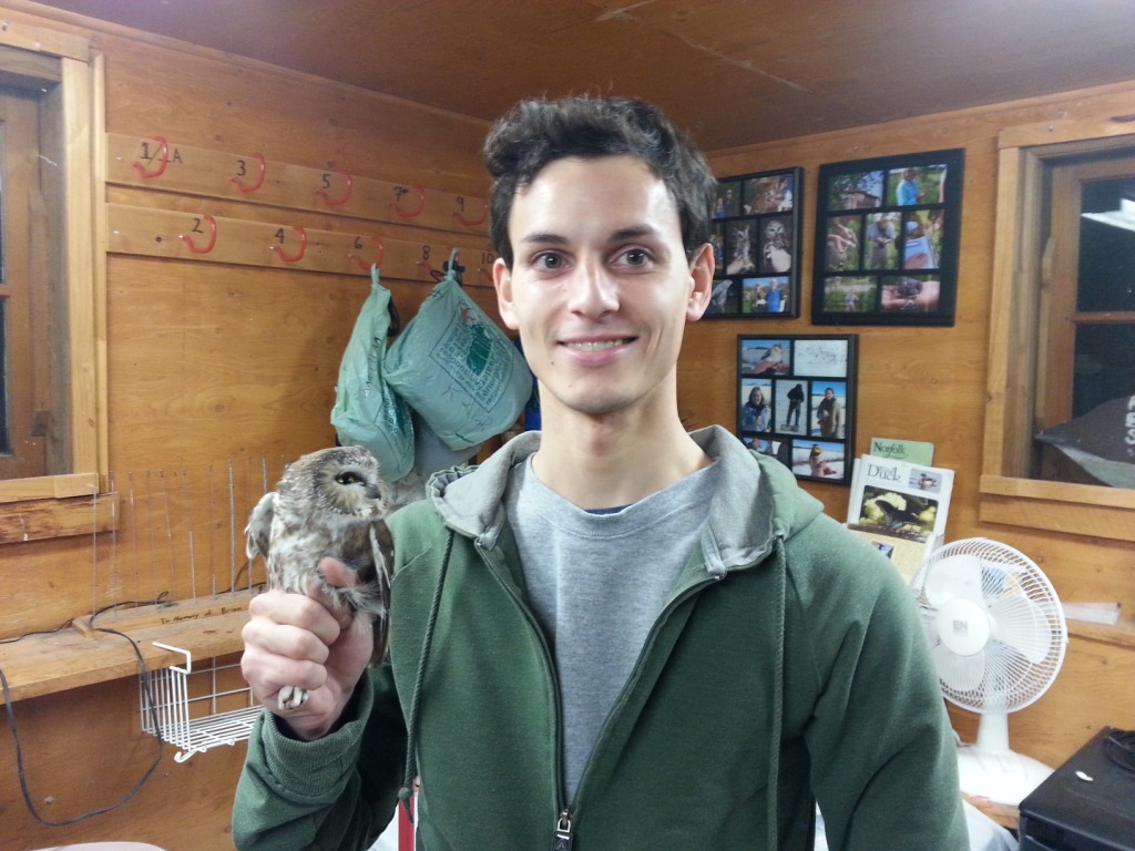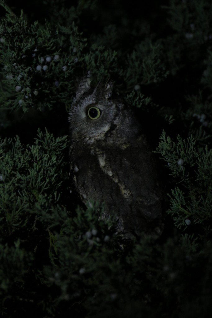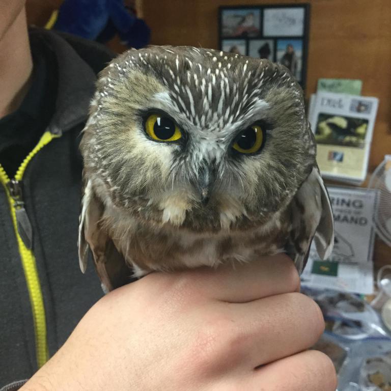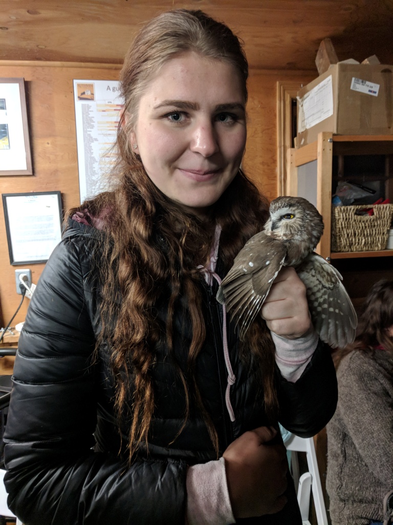 The temperature dropped as did the wind and we were confidently hopeful that the owls wouldn’t let us down. On the first round we got 4 owls all in the same net: 3 Northern Saw-whet Owls and an Eastern Screech Owl. Although it seems innocuous, the screech owl was quite likely there to predate a saw-whet…When the night was over we added another 2 saw-whets to the total. As a great finish to the owl season, Bob And Irene treated us to a buffet of home-made baked goods and coffee. It was a great night (thanks Irene!!!).