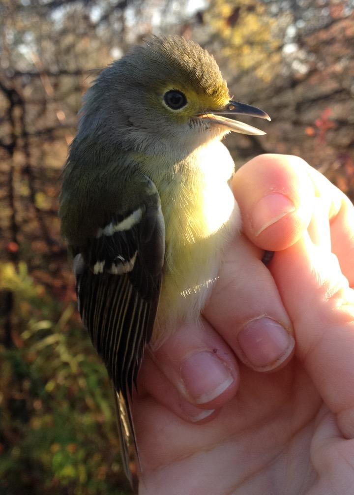 Early in the day a small group of grade seven and eight boys were helping with milkweed planting when Janice called us over to check out the gorgeous (and first ever!) White Eyed Vireo caught at our school!