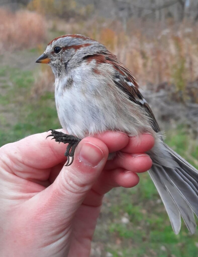 Today’s banding personnel were treated to an amazing sky first thing this morning. A sky that was issuing a warning: bad weather is imminent. But….we had a mission and were willing to challenge Mother Nature to achieve it. We needed to band another 5 birds before the end of the Fall season to reach 2000 and our end date is tomorrow….So we took our chances. And despite the gusting, building wind we did it!
