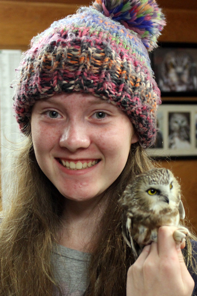 Let’s talk first about the owls. I just loved Clair’s description of the cute little Saw-whets: Bobble heads with huge eyes.We had tried several times early in the month to get some but it wasn’t until the night of the 14th-15th that we managed to attract a few, catching 6. Friday night Nancy put out the sound system again and got 3. I have been curious for some time as to whether Saw-whets follow the Grand River when they’re migrating or move south on a broad front. To begin to answer this question we put up a “T” net configuration at Taquanyah Conservation Area on Saturday. Taquanyah is 3.8 km from Ruthven and about 2.5 km in from the river. Saturday night Ben and I sat out in the cold (it got pretty chilly I can assure you) and tried our luck. We caught 3 owls until calling it quits at 11. The first one we got was a recapture of an owl that had been banded on October 13th, 2013 in Saint Louis County, Minnesota! It had been hatched in 2012. That was exciting.