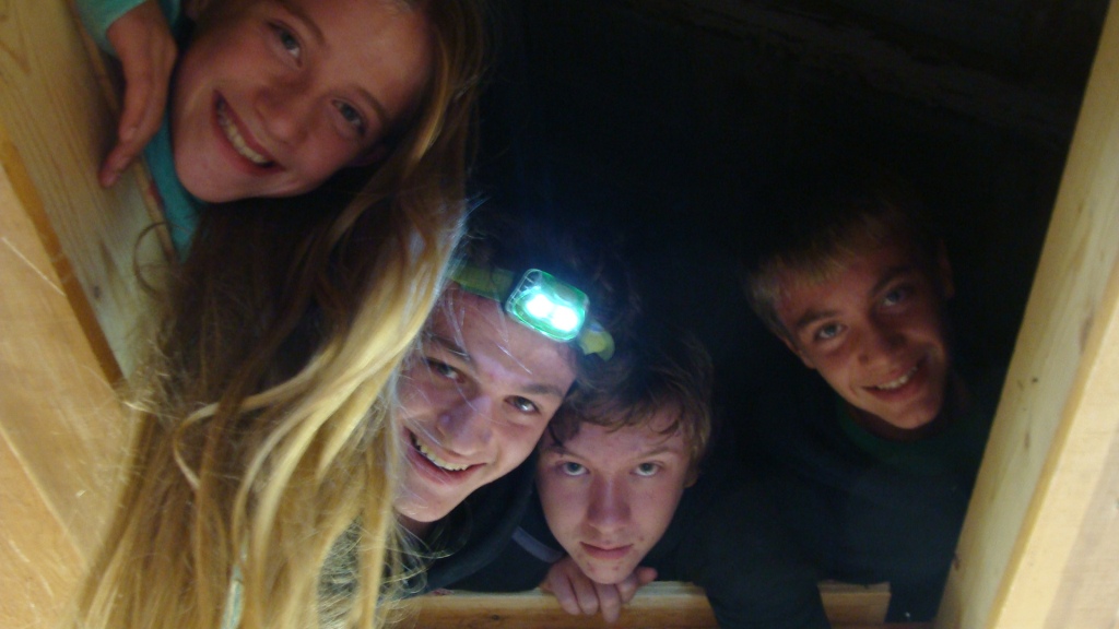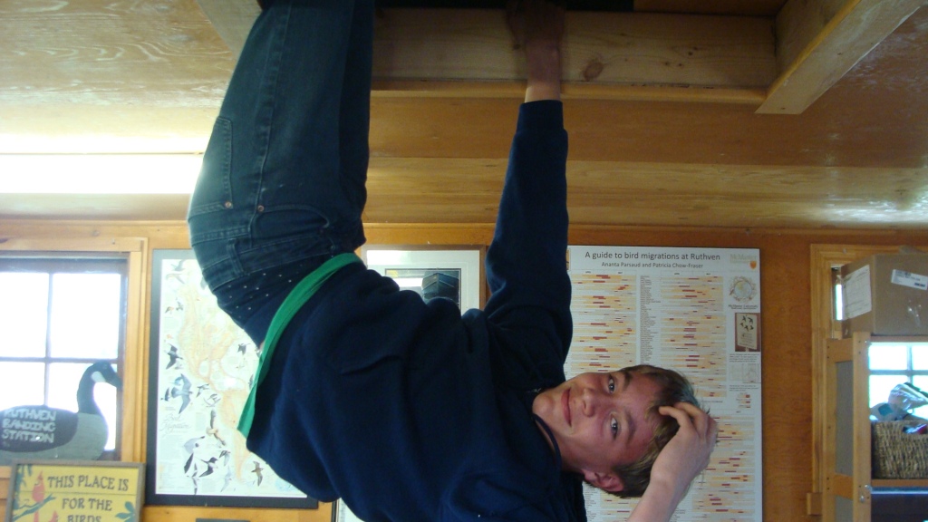 The slow pace from yesterday continued today, aided and abetted by unseasonably warm (hot?) weather and blue skies. Two of the Young Baggers had slept over in the banding lab and when they were joined by two more the boredom from the slow pace was transformed into a creative process. They explored the banding lab and discovered a hatch that lead into the “attic”. This they quickly began to transform into a sleeping loft for future stayovers. It would certainly remove the clutter of sleeping bodies on the banding lab floor and move the snoring to a better place. Of course these guys can’t seem to do anything without some hijinx: