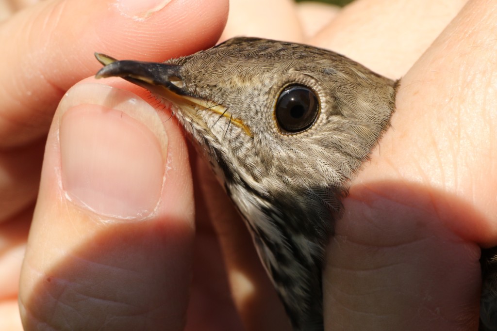As at Ruthven, the hot weather has reduced bird numbers to a trickle. We were able to tap into a flock of American Robins that had roosted in an oak close to the nets but other than that it was slow going. We did see some interesting birds though while doing a census, including the first White-throated Sparrows of the Fall season.