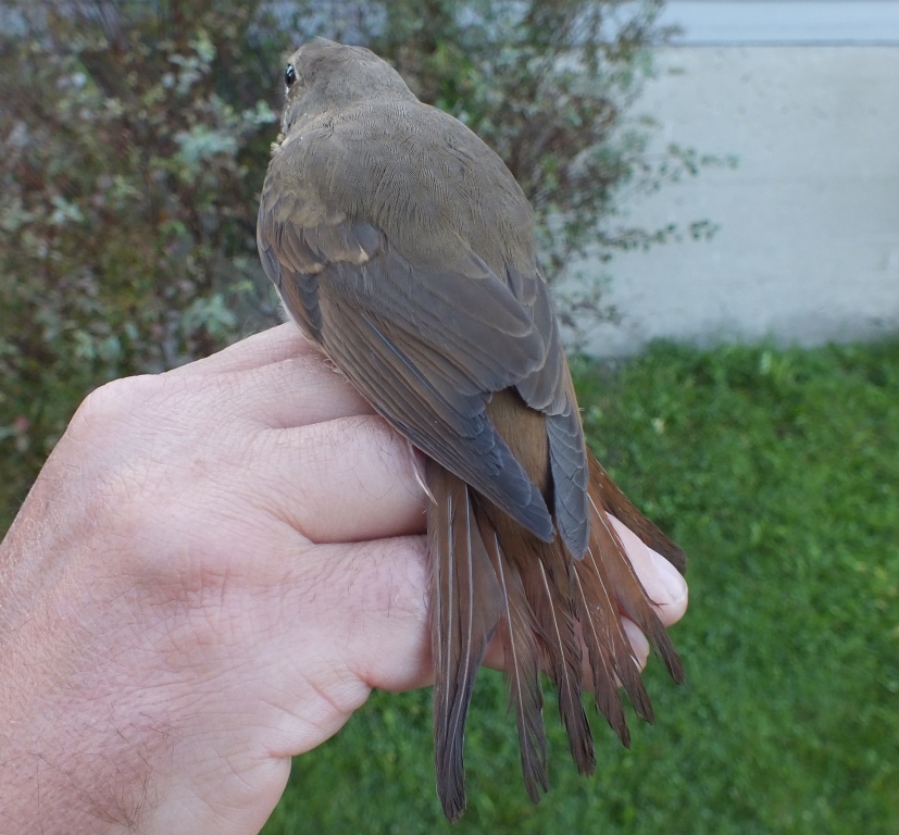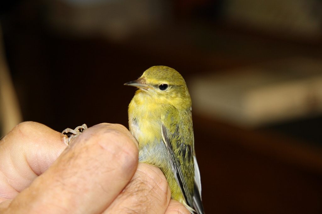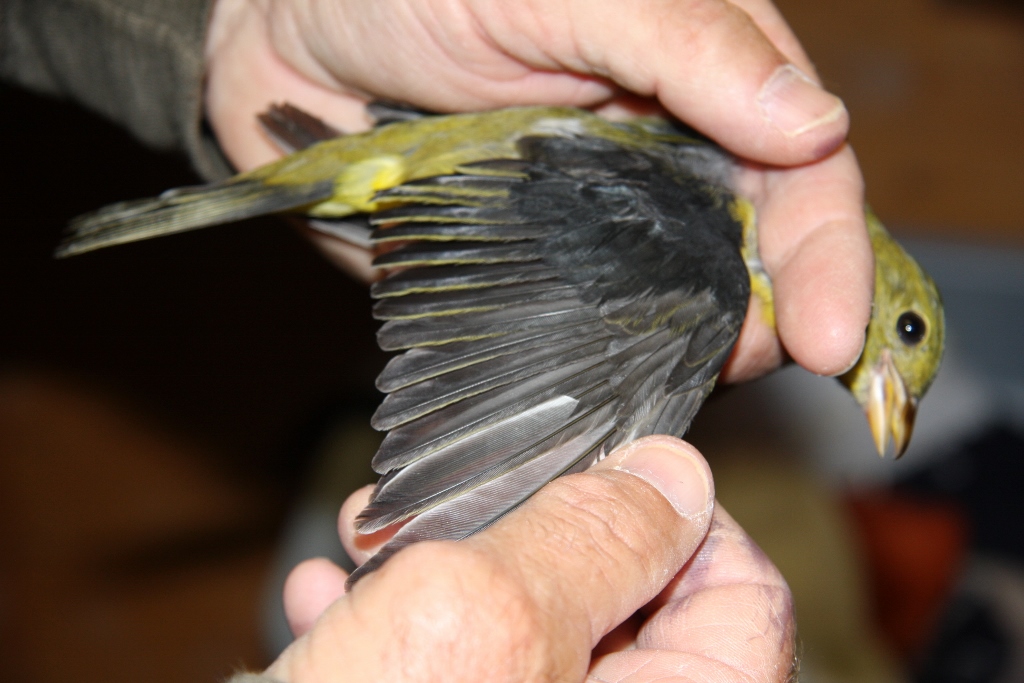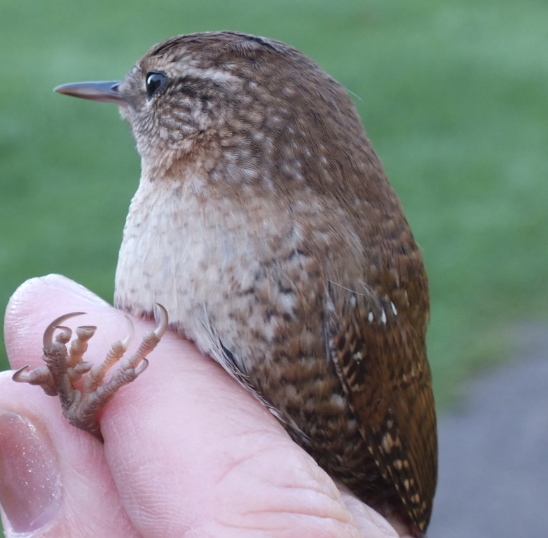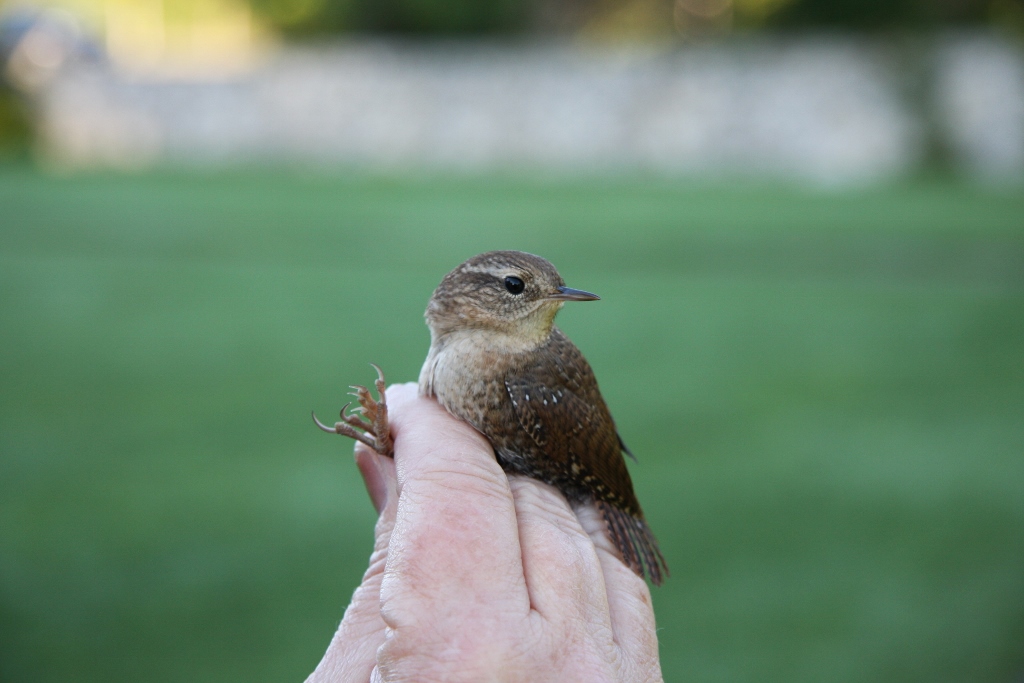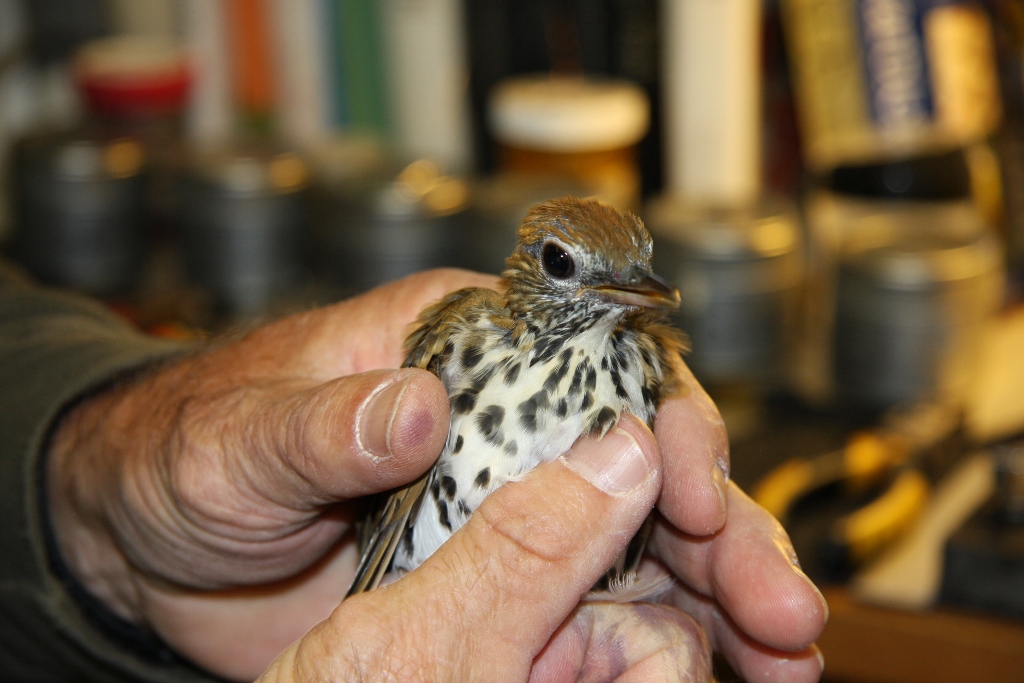 The 23rd was ok by these weather standards – a good first round which produced the first Winter Wren of the season. But today was little short of a disaster: we banded only 12 birds and had only 5 retraps. The rate of capture, 10 birds/100 net hours, was terrible. Fortunately, we banded the first Hermit Thrush of the season; Peter Thoem got the first Yellow-rumped Warblers on census; and a small flock of Bonaparte’s Gulls winged their way down the river.