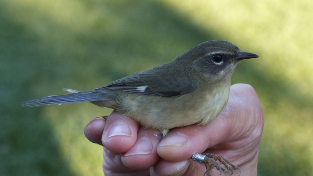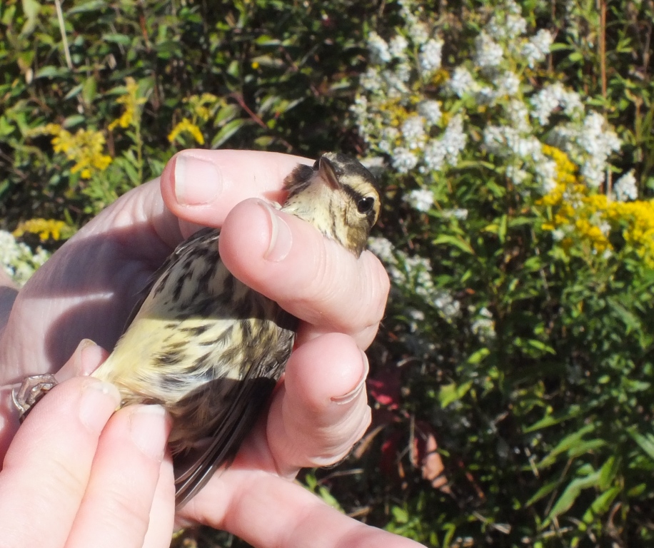 A great day to be outside! There was a good variety of birds around….just not down low in the area of the nets. So we did some work, made some changes: took down Net #1 and helped Carol put up her net – 4″C”. It will now be in competition with Nancy’s (1A), mine (6A) and Ben’s (9B). It got off to a great start – a Northern Waterthrush! We also put up 3 nets in the Meadow chain which we will use to see what migrants use the meadow as a stopover.